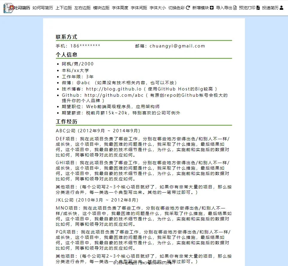 如果你對簡歷樣式沒啥要求,那麼可以試試這個網站,一眼就能看出it男的直男審美