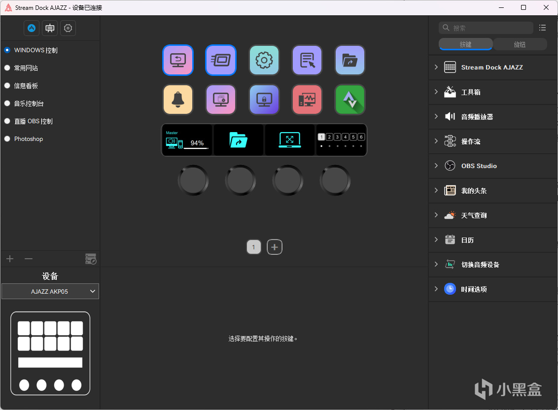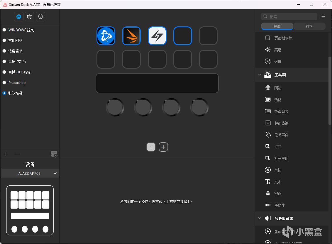 提供了那么多按键和旋钮,那么我们究竟该怎么设置呢?在官网上看,好像非常的复杂,但是实际上入门非常轻松,下载好驱动后,里面会提供几个常用的场景,例如window的控制,常用的网站,音乐控制,或者是OBS控制。真的非常方便。