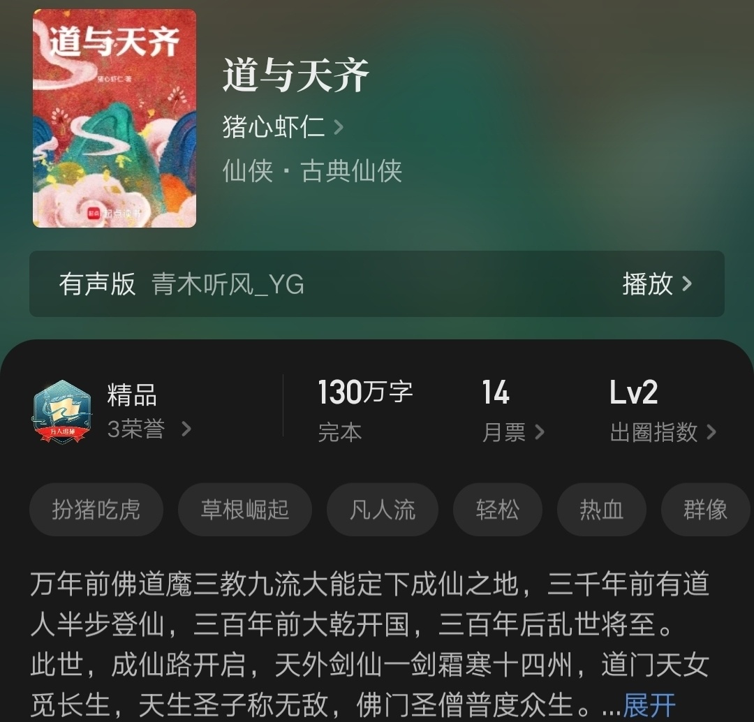作者坦言想帶家族脫貧,反被拖入深淵,被迫用稿費填坑,導致新書《道與天齊》後期倉促完結,非常對不起書友。豬心蝦仁表示將暫停創作,先解決現實爛攤子。