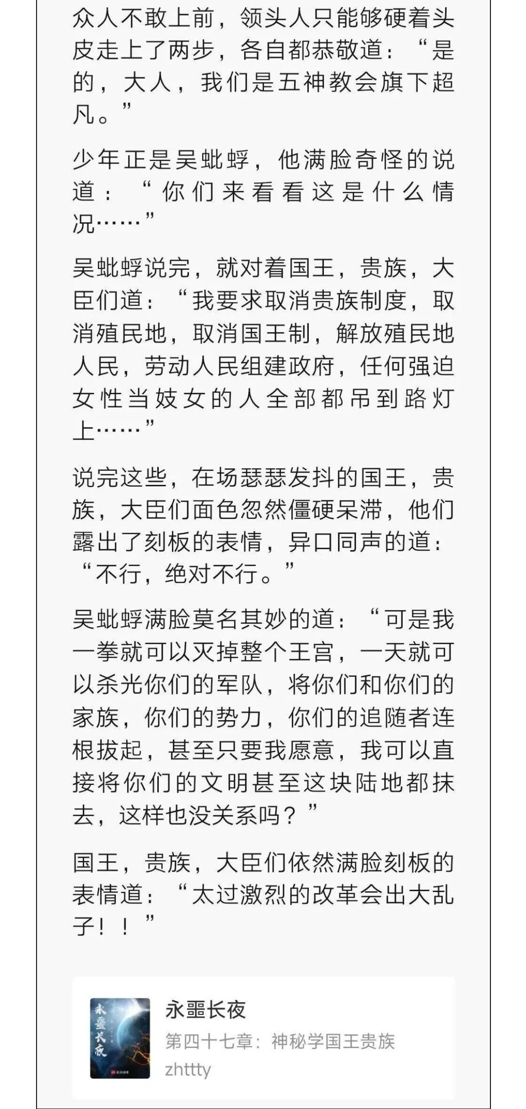 《永噩長夜》是z大又一本無限流小說,最新的這個副本和宿環有點像,都是以西幻蒸汽時代爲背景,但主角團改革路徑截然不同。《宿命之環》主角團雖實力強大,卻因畏首畏尾,連妓女的問題都解決不了,未能推動深層變革;而《永噩長夜》主角則以雷霆手段破除階級壁壘,直接推翻教會壟斷,現在兩本書的書評區都在討論這件事,說Z大這是拿烏賊當對照組,教他寫小說。