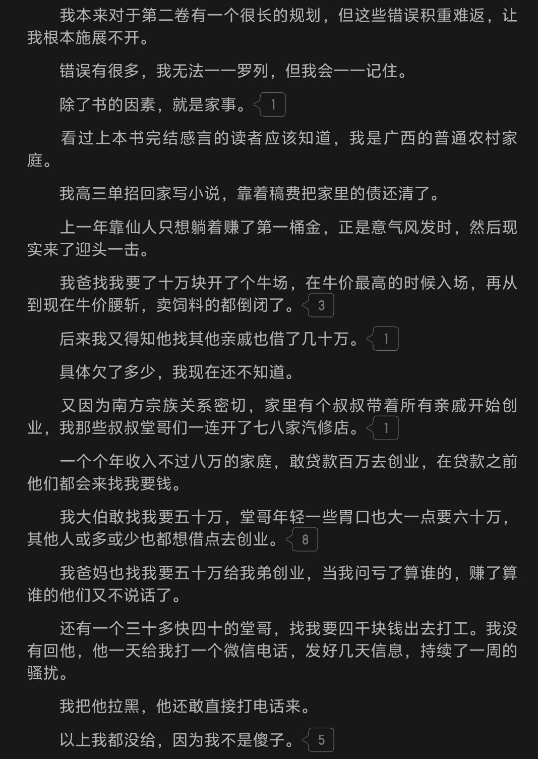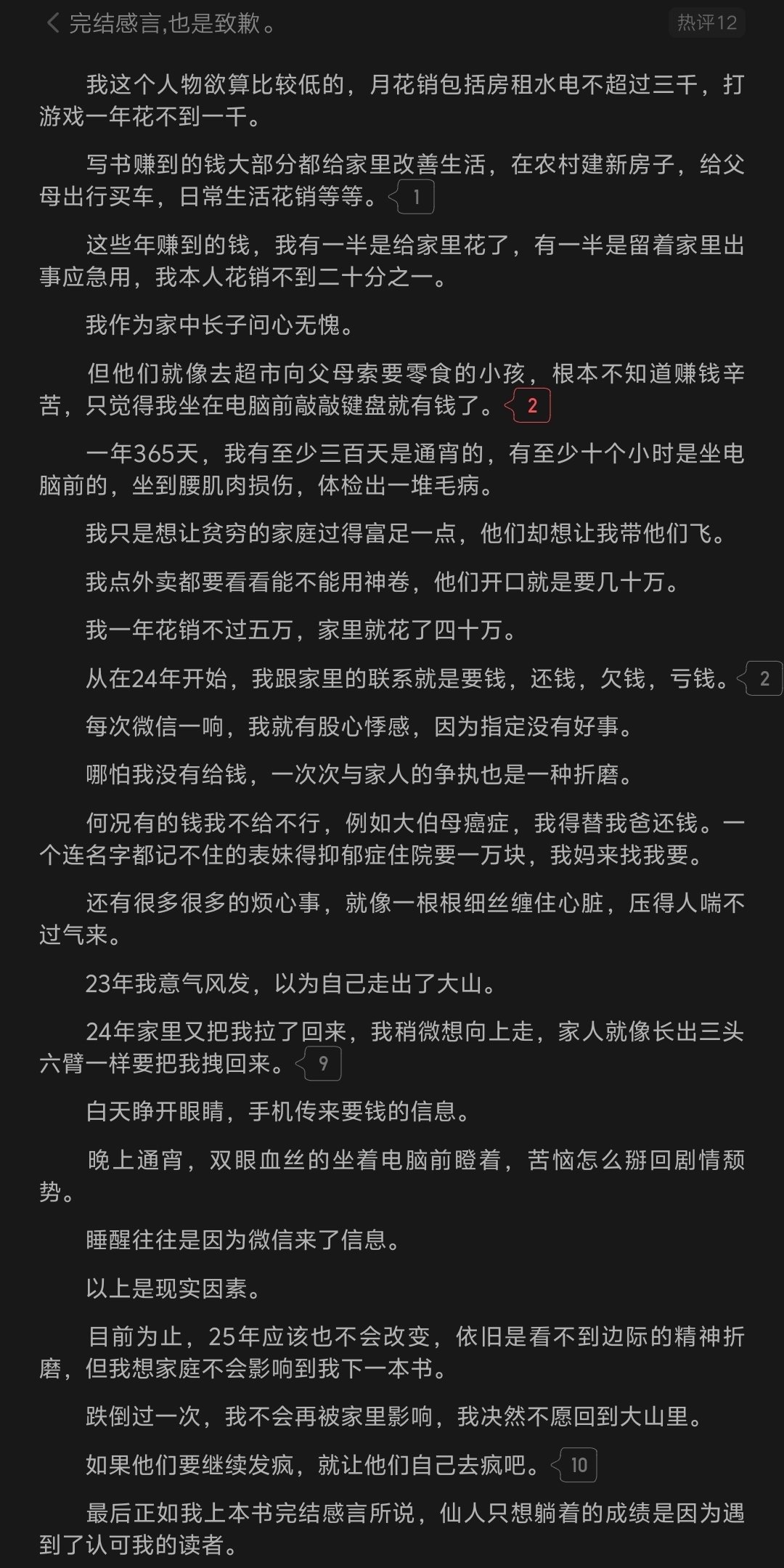 看到這個消息我其實挺感慨的,這種成績在起點也算是很不錯的了,沒想到能被家庭搞成這樣,導致小說也半爛尾了。所以現在有不少有能力的作者都是自己獨立生活,應該也是不想讓家庭影響自己。