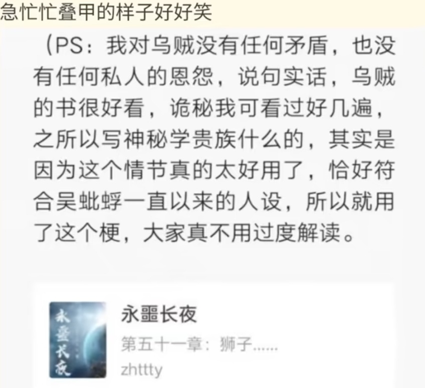 抄襲指控升級:肘子發微博直言“曾介意別人抄襲自己辛辛苦苦想出來的想法和亮點”,點名番茄平臺某本“情緒流+靈氣復甦”的丐版《大王饒命》(明眼人都可以看出來是《開局地攤賣大力》)及起點某大神“扒大綱抄襲”,稱自己已經拉黑他了。不過這個人我倒是不清楚是誰,有盒友知道嗎?