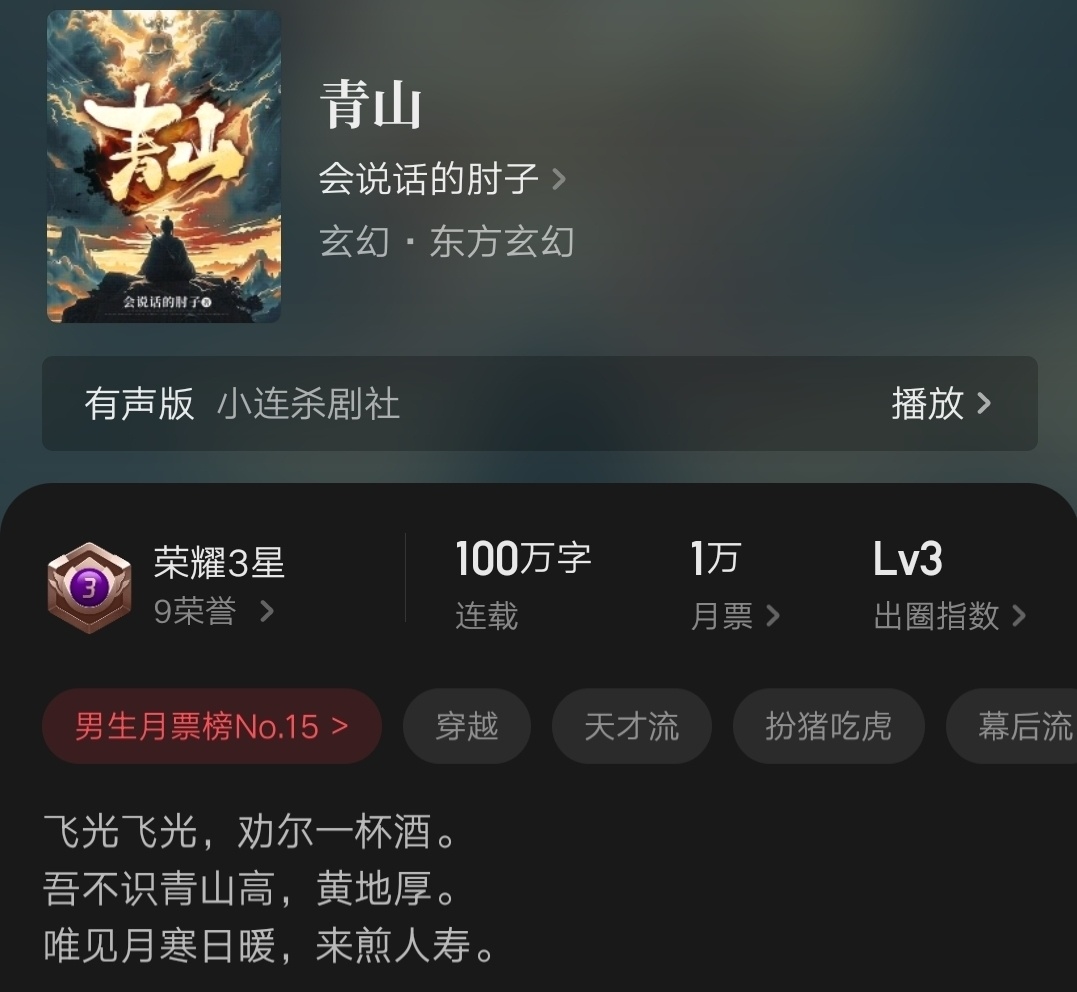 白金作家會說話的肘子新作《青山》成爲起點2025年第三部十萬均訂作品,但慶功之際卻掀起罵戰。 據起點數據顯示,《青山》雖然憑藉不錯的設定和穩定的粉絲,均訂從9.5萬至10萬還是用了三個月(去年12月底他直播時說的9.5萬),估計就是更新慢和不穩定的問題。之前因爲豬肘大戰和本本小說高開低走,導致人品和口碑快能和唐家三少坐一桌了,不過現在看來忠實粉絲還是挺多的。