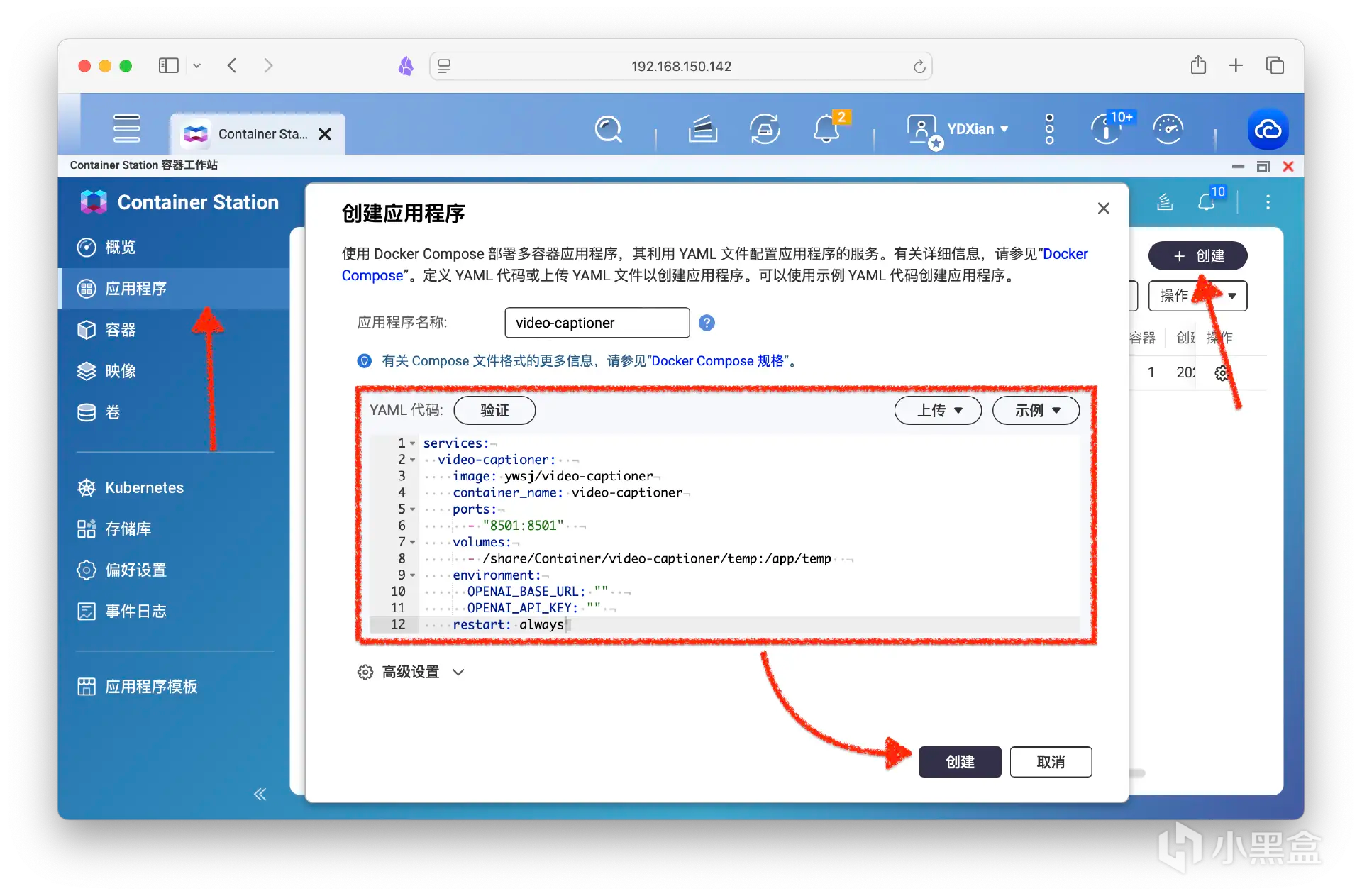 以威聯通NAS爲例,通過Docker Compose一鍵部署。黑盒這邊不支持插入代碼,大家參考一下圖片注意格式對齊。