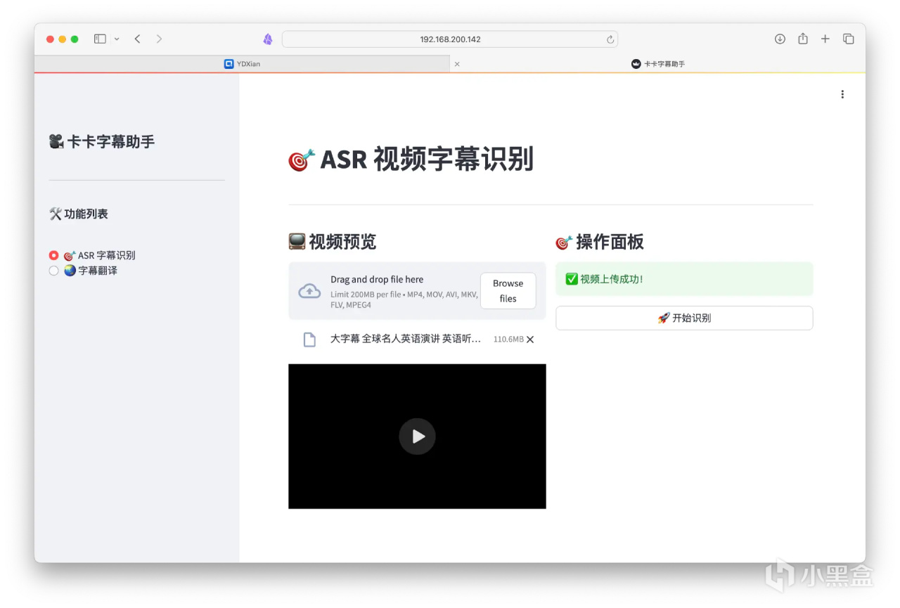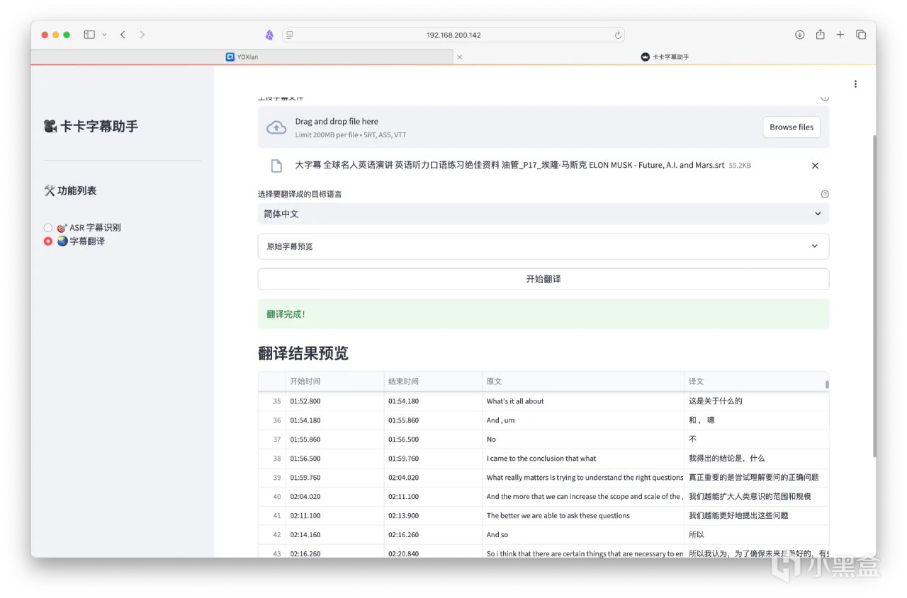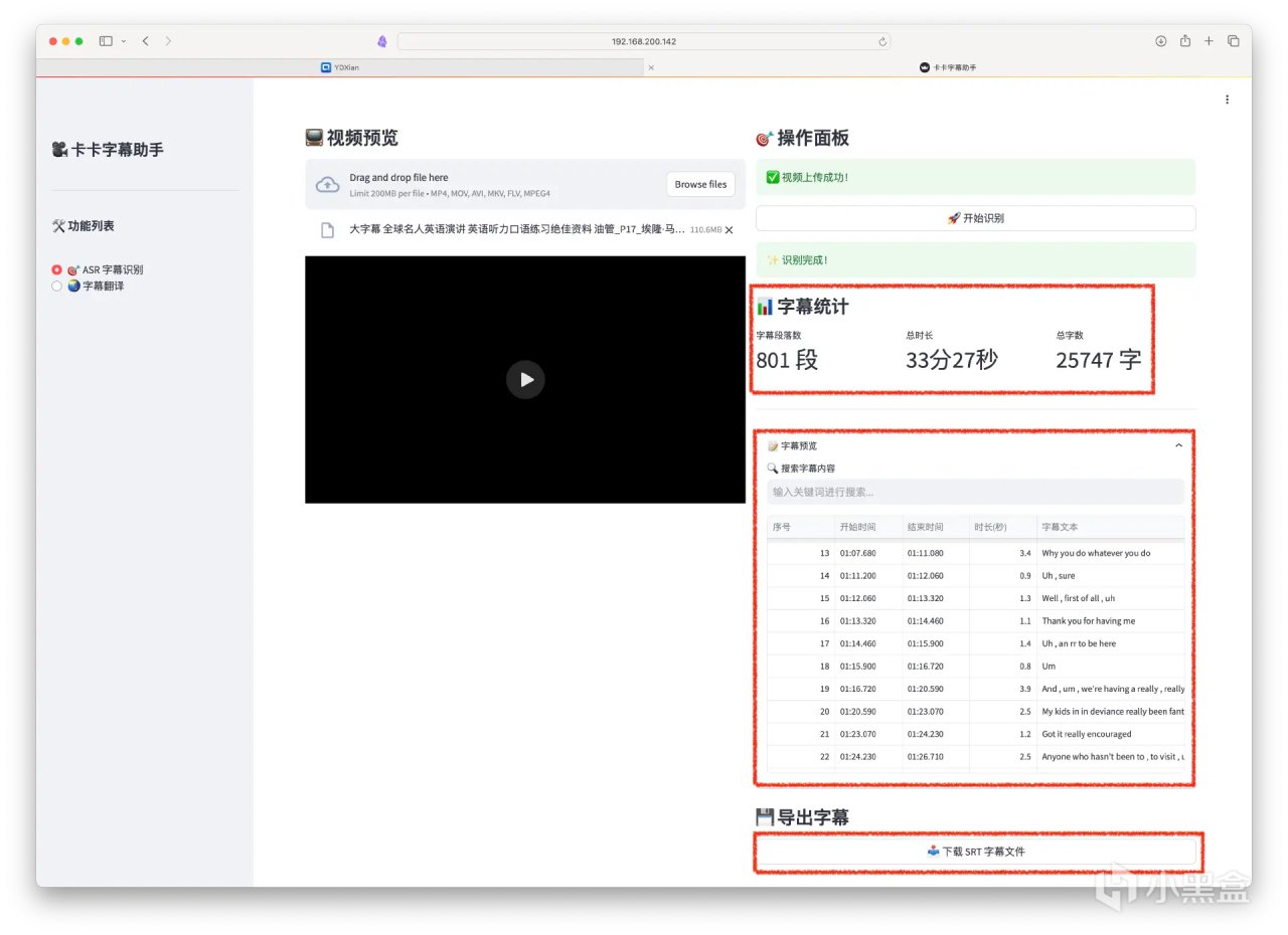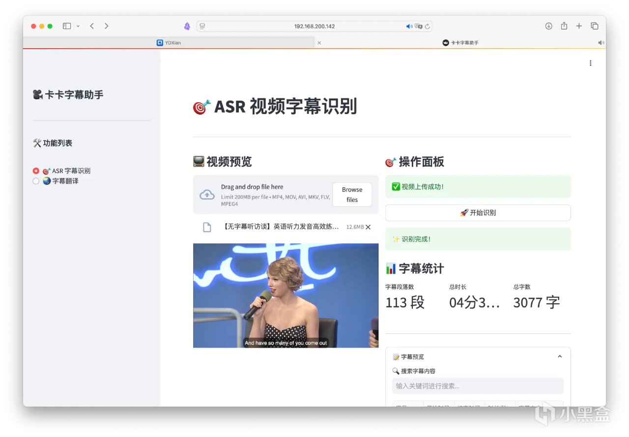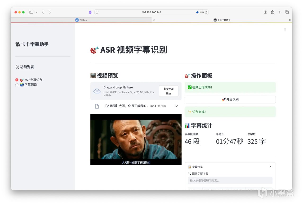 目前卡卡字幕有Windows客戶端(完整強大免費),也支持Docker一鍵部署超級輕量版(網頁版限制視頻大小200MB,語種有限)。