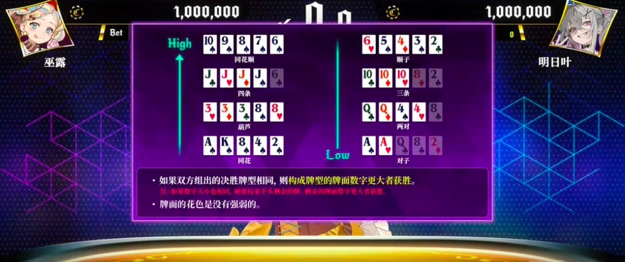 如果最终两人选择比较,则会按照德州扑克的规则直接比较大小,即使你之前完全不了解其实也能玩,游戏中因为千术的存在,这部分其实被简化了很多。