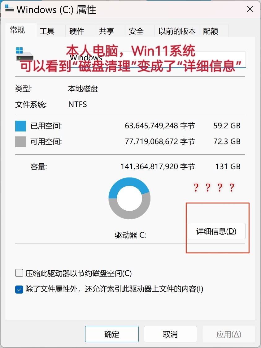事实上Windows11系统右键C盘→属性中的“磁盘清理”被替换成了“详细信息”(图6),需要键盘win+r→输入cleanmgr后确定→选择C盘(图7),这样才能调出Windows自带磁盘清理,我不知道为什么那么多教学视频连这点提都不提,Win11用户不是人吗?