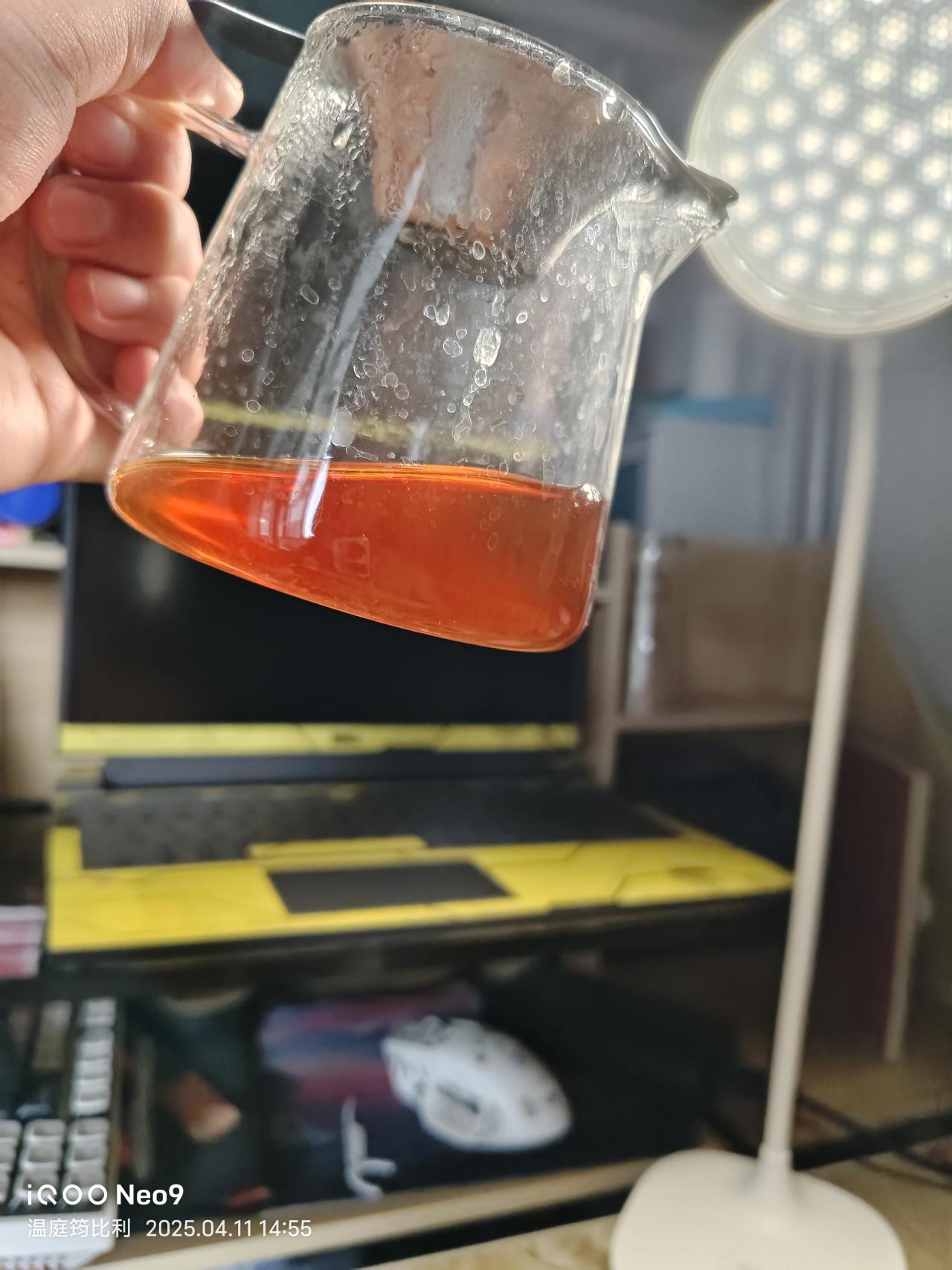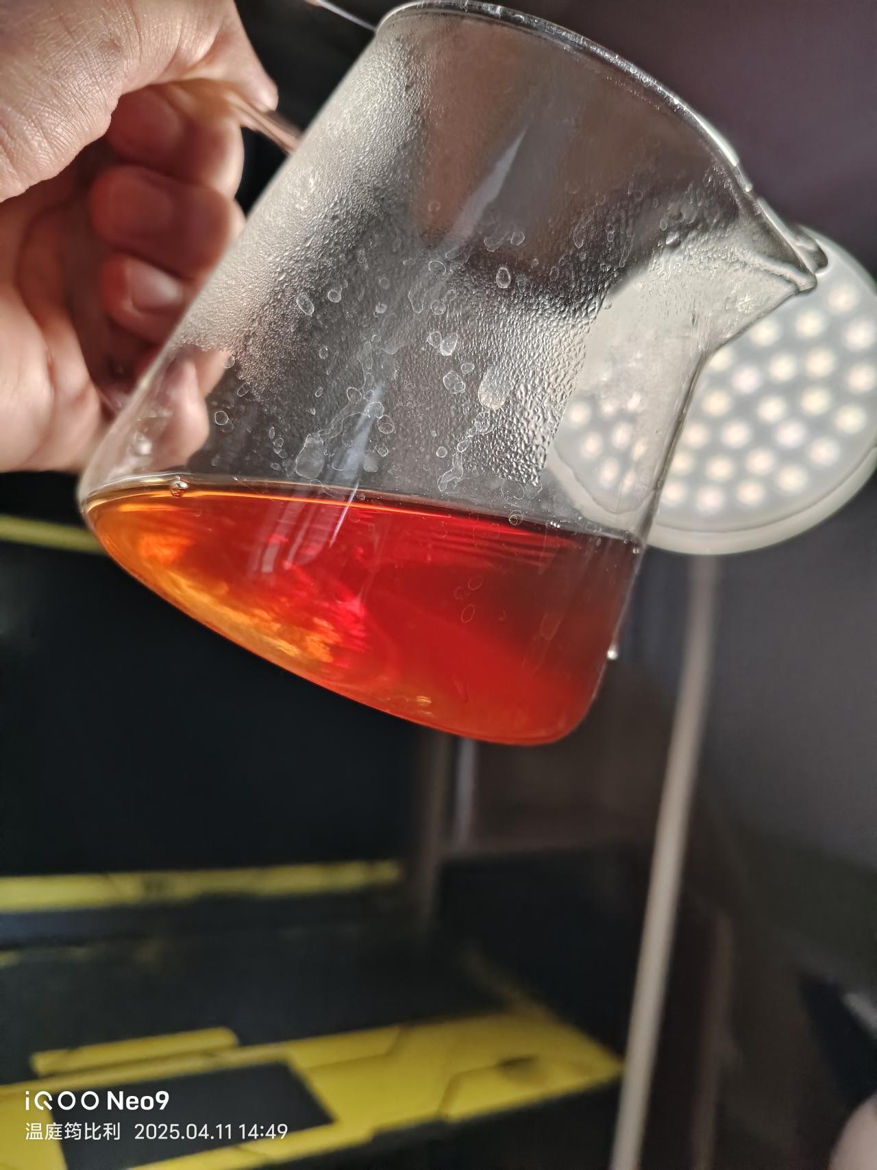 第四泡,正式开始品茶。第一泡,100度沸水注入,不坐杯秒出汤,茶汤橙红色,熟果香为主,香气高扬。温度降低后品饮,入口汤水稠,柔顺,甜感明显,可喝到岩茶特有的岩骨花香。由于茶汤醇厚,能感到舌头被茶水包裹。