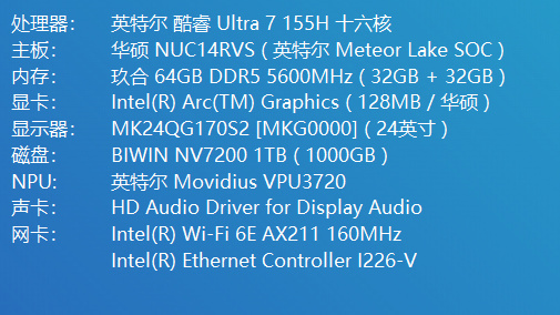 去年的时候,我购入了华硕的NUC 14 Pro+,作为一台内置Ultra 7处理器的mini小主机,这款NUC还是非常强力的!只不过我给它配的单通道16GB内存有点捉襟见肘,毕竟核显要吃一部分,剩下的内存勉强够用,游戏帧数也比较低,而且当我想玩玩本地部署32b DeepSeek大模型,系统提醒我内存不足……明显搞不定,所以得换大容量内存咯!