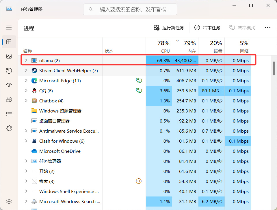 此时,可以看见deepseek直接占用了43GB内存,真的好可怕!