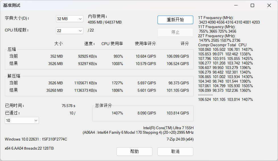 7-ZIP解压缩软件的基准测试功能,可以反映出电脑日常的办公运行效率,对CPU和内存的性能非常敏感,仅供参考:
