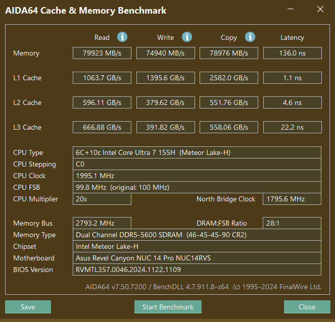 在AIDA 64的内存测试里,玖合DD5 5600 64GB套条的读、写、拷贝速度约为79.9GB/s、74.9GB/s、79GB/s,符合5600MT/S频率下DDR5内存的常规表现,非常强!