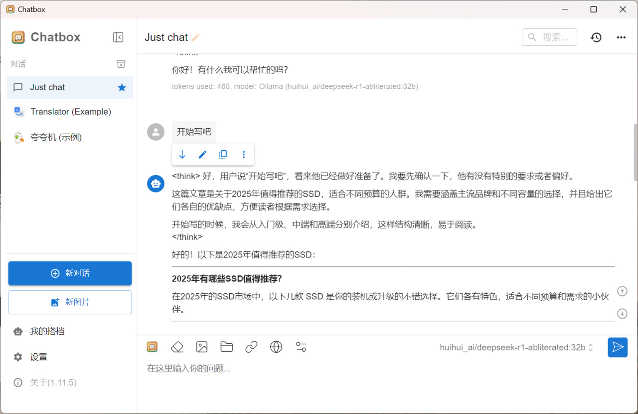 我们还是退回到32b吧,更有实用性。在我的迷你主机上,搭配玖合 64G DDR5 5600 笔记本内存可以顺利运行32b的deepseek,此时一秒大概2-3个tokens,虽然速度不快,但玩玩还是可以的。