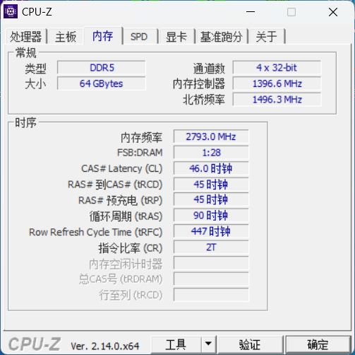 通过CPU-Z也可知,这款内存运行在了5600MT/s的频率下,时序为CL46-45-45-90,属于非常标准的DDR5 5600笔记本内存了。