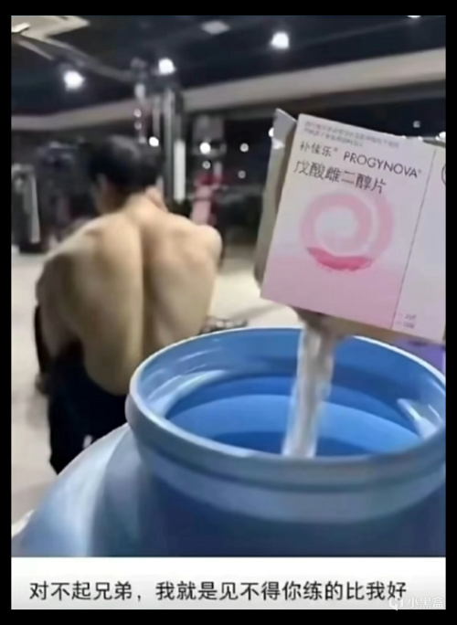 因为这张梗图的另一个版本是往里面倒戊酸雌二酮醇片(雌性激素)