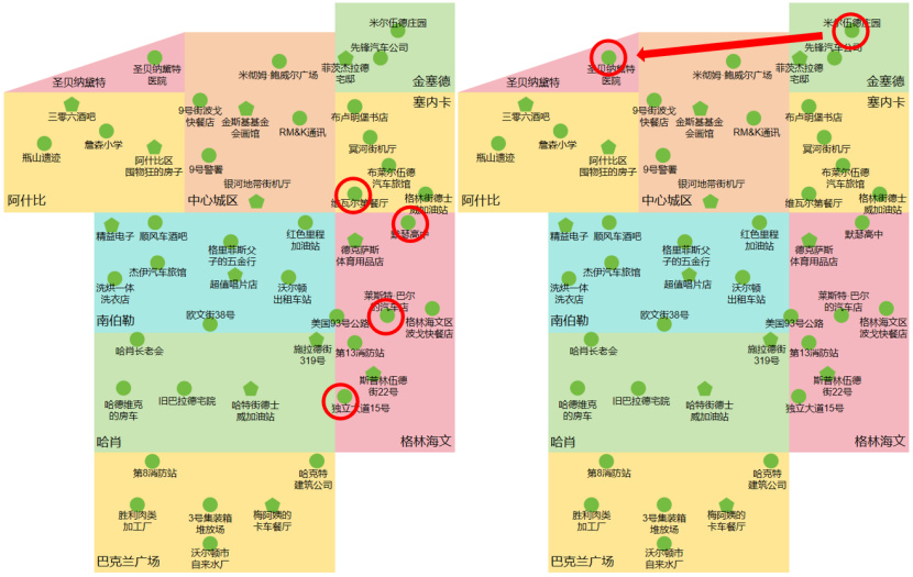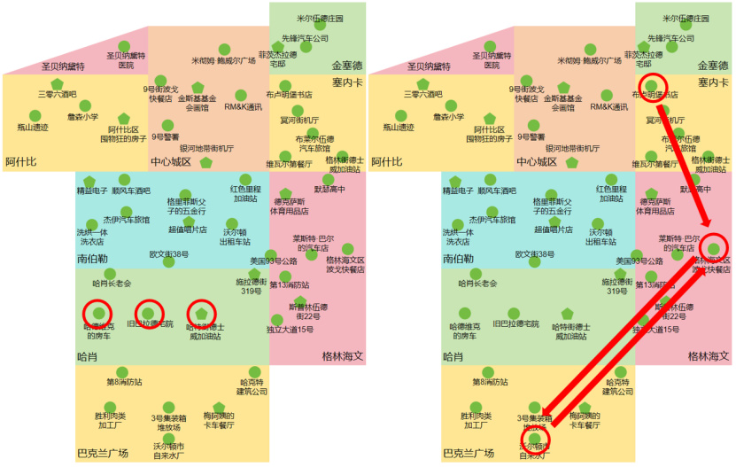 任務路線:塞內卡的【布盧明堡書店】→格林海文的【格林海文區波戈快餐店】→巴克蘭廣場的【沃爾頓市自來水廠】→【格林海文區波戈快餐店】