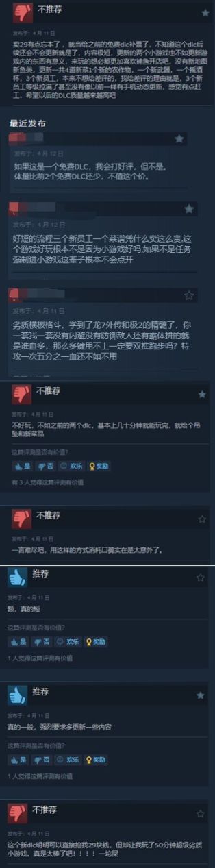 DLC定价为29元Steam国区,主机PS5DLC定价几乎贵一倍,部分玩家反馈其主线流程仅2-3小时即可完成,且新增的剧情任务和玩法模式相对单一,导致部分玩家认为“性价比不足”。例如,尽管DLC融合了《如龙》的横版卷轴战斗机制,但战斗场景和敌人种类较少,缺乏深度扩展。