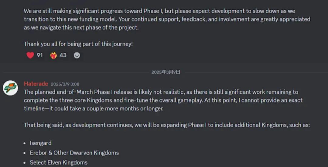 第四个模组是《人类纪元》,接下来的开发计划是增加艾森加德、埃瑞博和其它矮人国家以及精灵国家。制作组表示这是一项艰巨的任务,衷心感谢一路上做出贡献的每一个人。