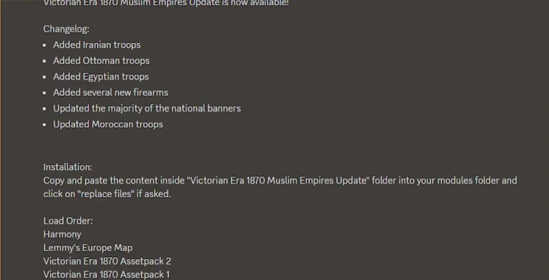 第三个模组是《维多利亚时代》,增加了伊朗、奥斯曼和埃及兵种,并更新了部分摩洛哥兵种。制作了了几款新的枪支,和众多国家的旗帜。