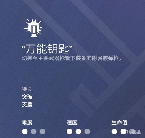 技能“萬能鑰匙”:爲主武器下掛霰彈按下技能鍵切換,目前彈匣6,備彈25發。