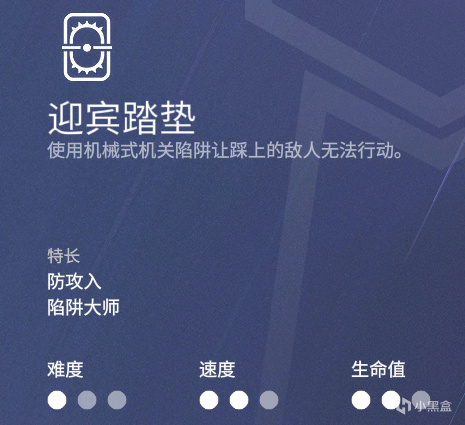 技能“迎賓踏墊”:按住技能鍵放置一個可被破壞的機械裝置(就是捕獸夾),進攻方經過時立即觸發夾倒使其進入倒地失血狀態。