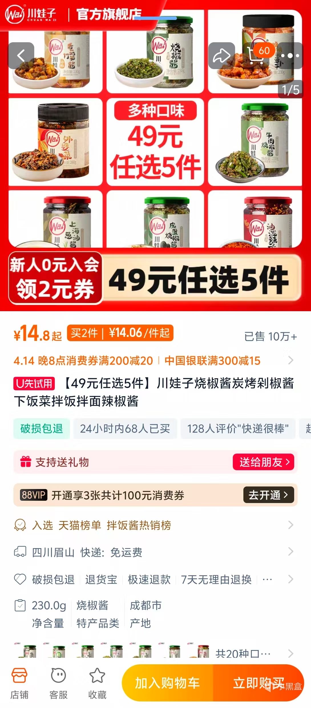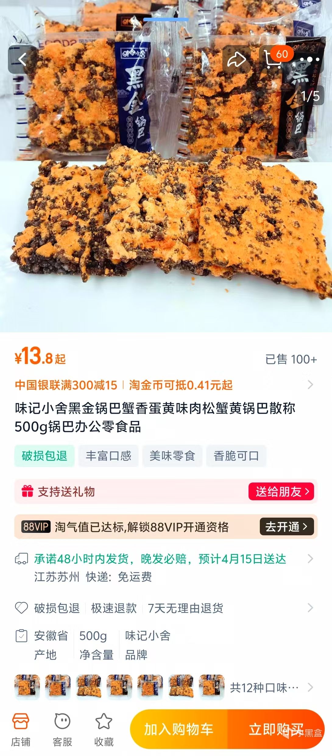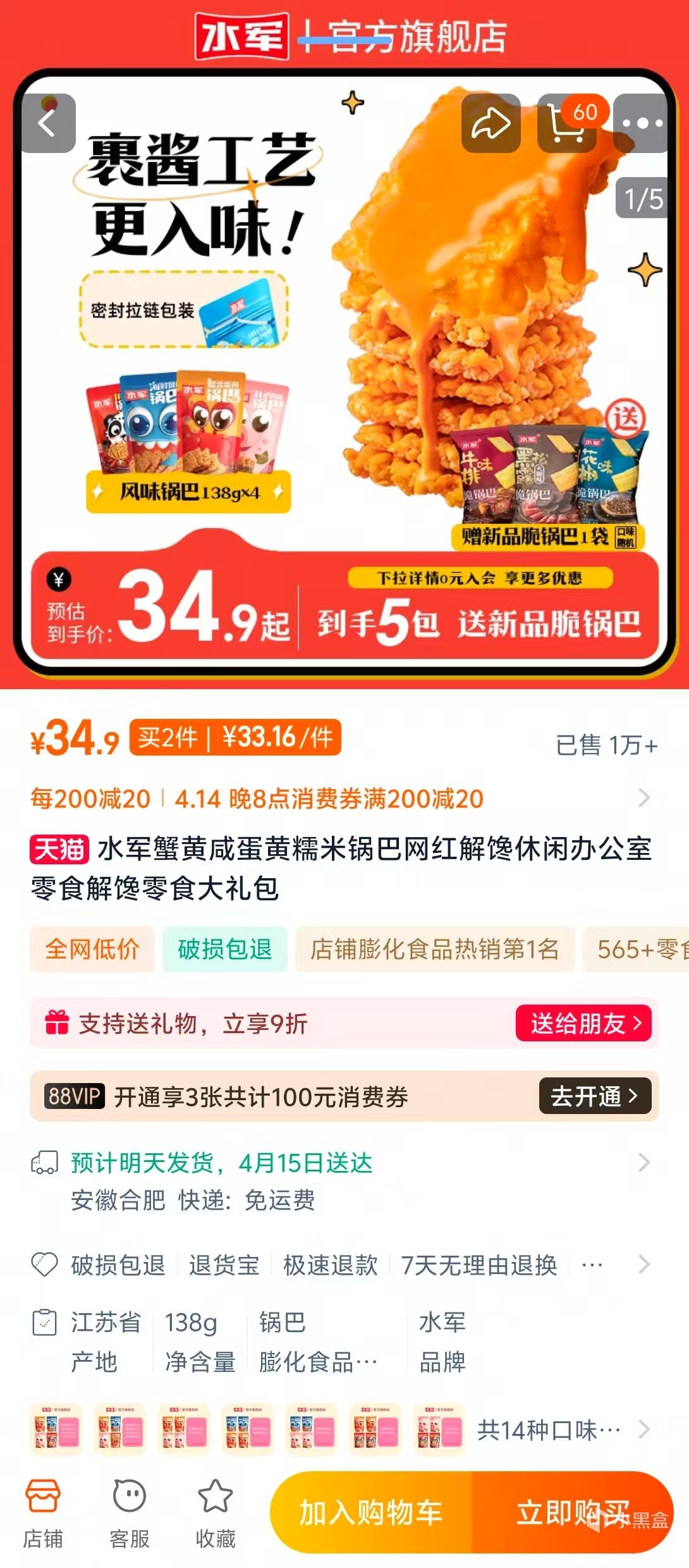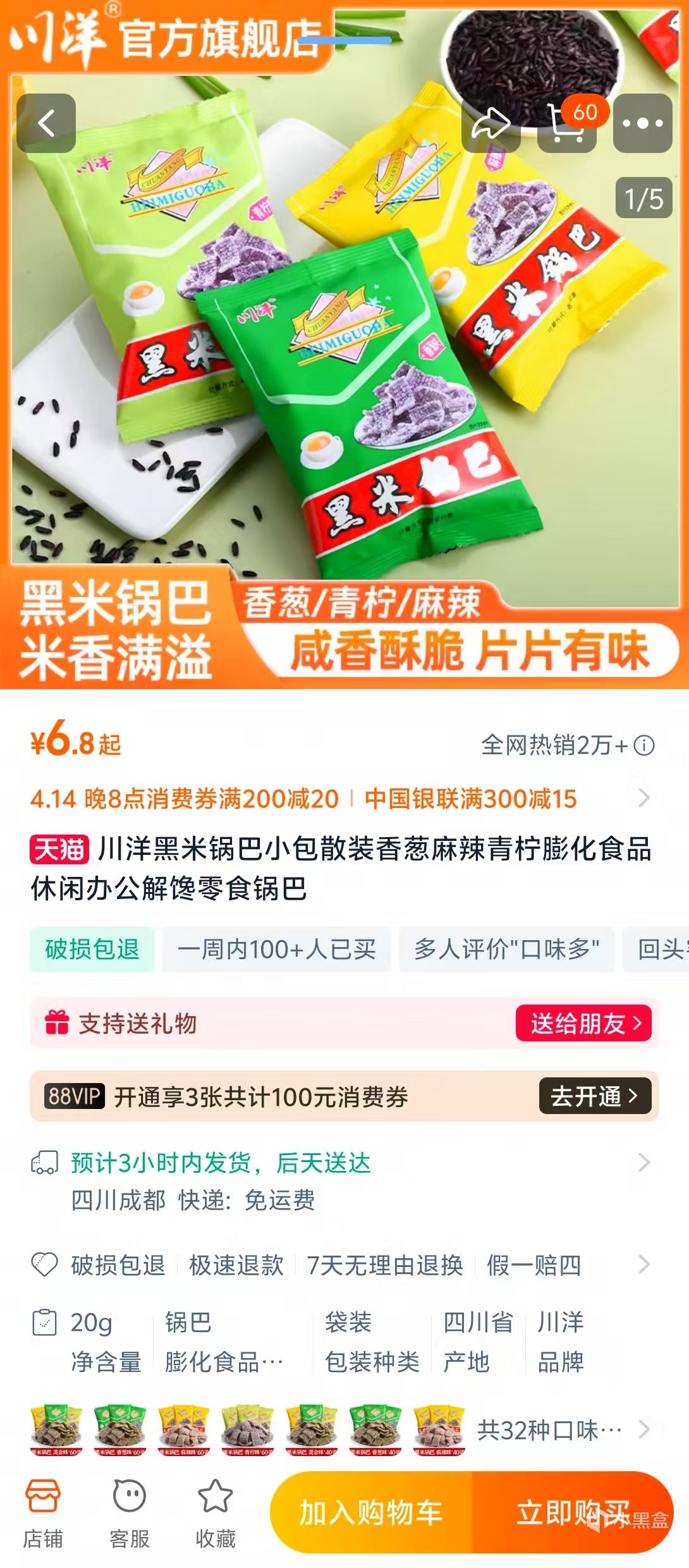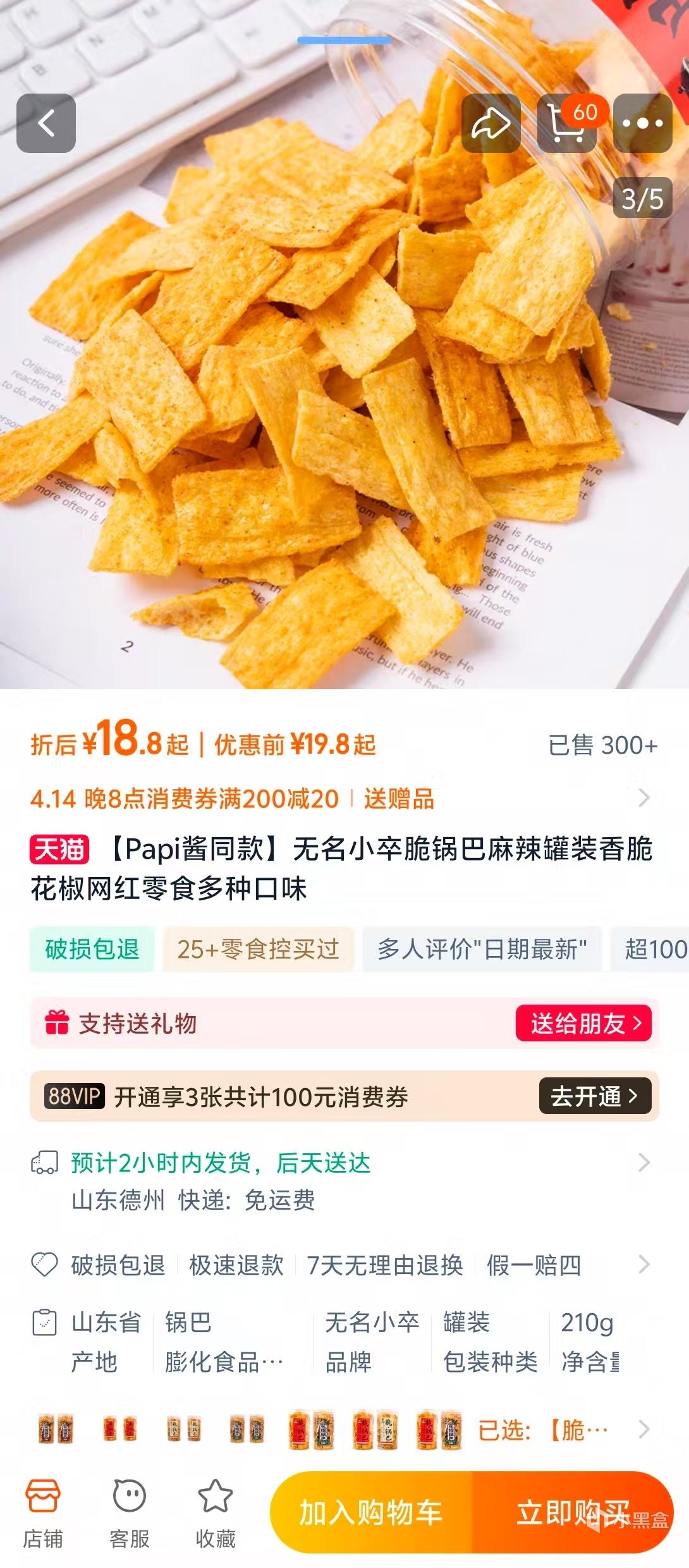 淘寶(關鍵詞:Papi醬推薦無名小卒脆鍋巴) 18.8r/2罐