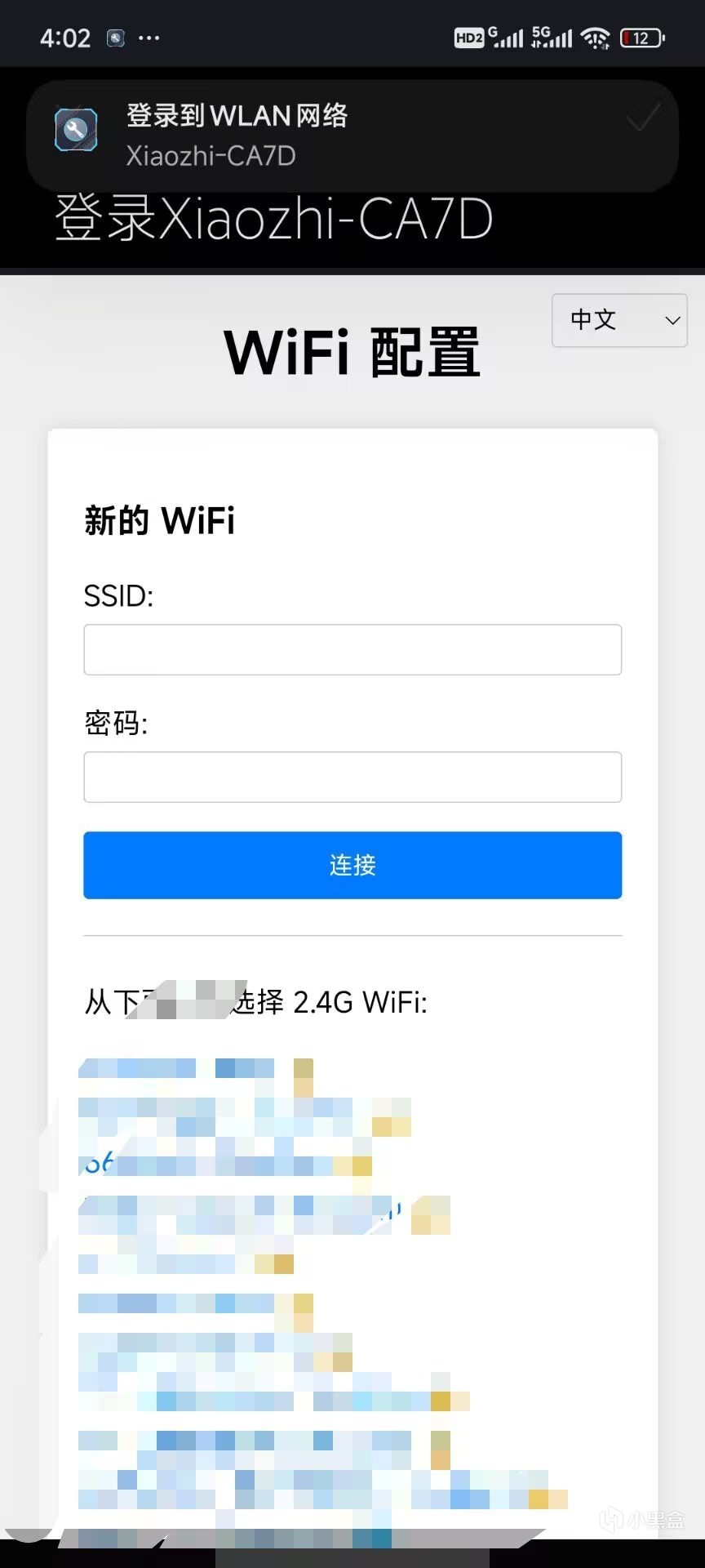 點擊開發板上RST的按鈕,打開手機,會出現一個帶有xiaozhi-.......的無線網,點開後選擇我們的2.4G無線網(手機熱點也可以)(蘋果好像要在瀏覽器裏輸入網址:192.168.4.1)。