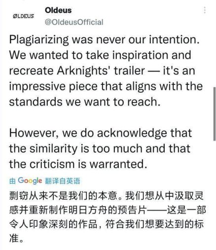 而對於鷹角網絡的質疑,Oldeus在其官方推特發表推文回應:抄襲並非本意,只是從中汲取靈感