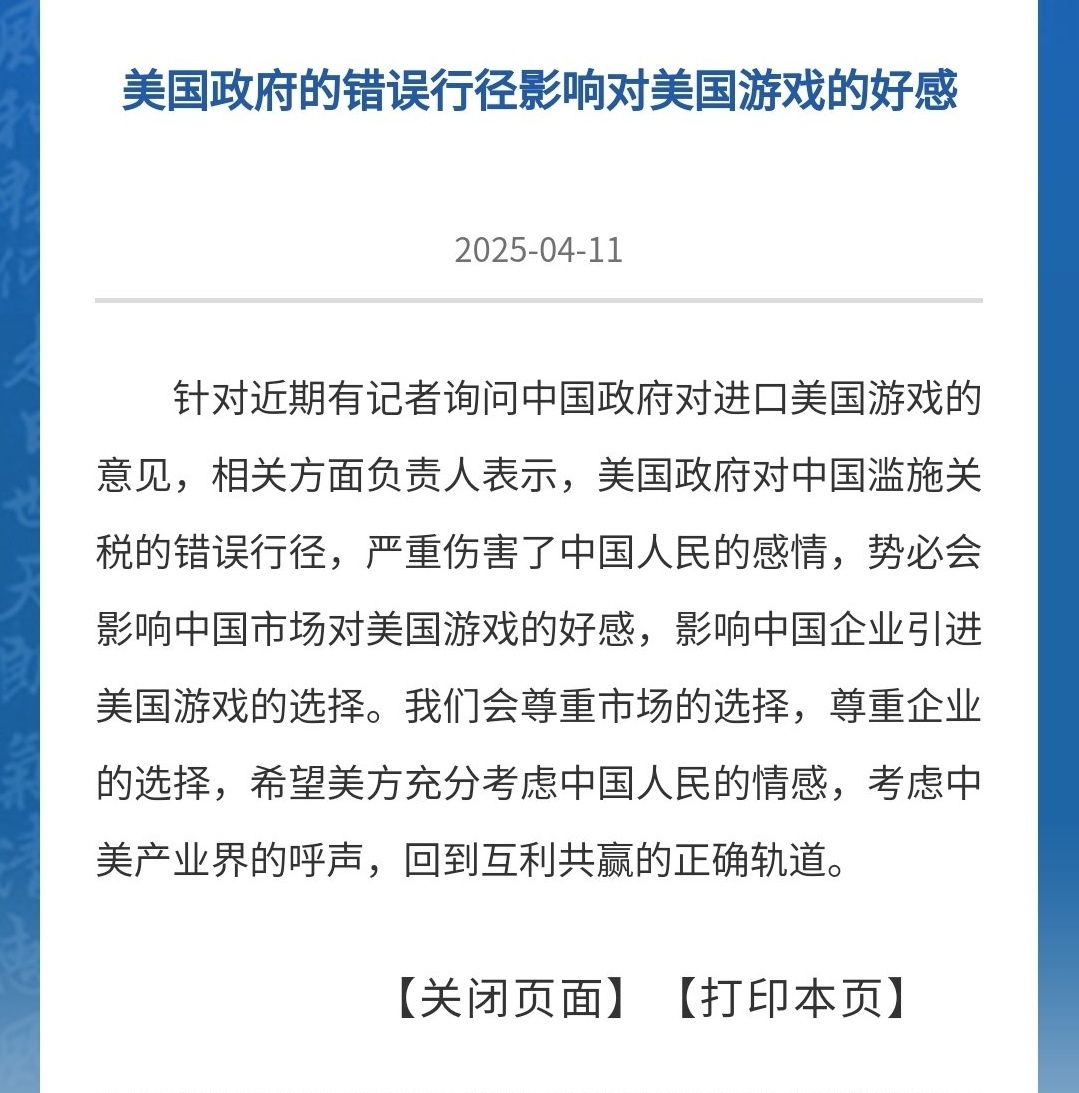 針對近期有記者詢問中國政府對進口美國遊戲的意見,相關方面負責人表示,美國政府對中國濫施關稅的錯誤行徑,嚴重傷害了中國人民的感情,勢必會影響中國市場對美國遊戲的好感,影響中國企業引進美國遊戲的選擇。我們會尊重市場的選擇,尊重企業的選擇,希望美方充分考慮中國人民的情感,考慮中美產業界的呼聲,回到互利共贏的正確軌道。