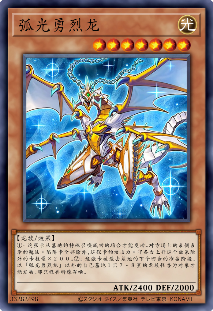 巨龙的名字叫做弧光勇烈龙,是龙之灵庙里面的守护巨龙,也是所有死后巨龙灵魂的掌控者。对于青色眼睛的少女擅自闯入龙族禁地,回想起千年前巨龙们遭到人类的背叛而被大量抹杀的历史,弧光勇烈龙对青色眼睛的少女发起了蛮横的攻击。危险时刻,青色眼睛的少女召唤来了青眼教堂的圣兽“白色灵龙”,然而在愤怒的弧光勇烈龙面前,白灵龙也不是对手。