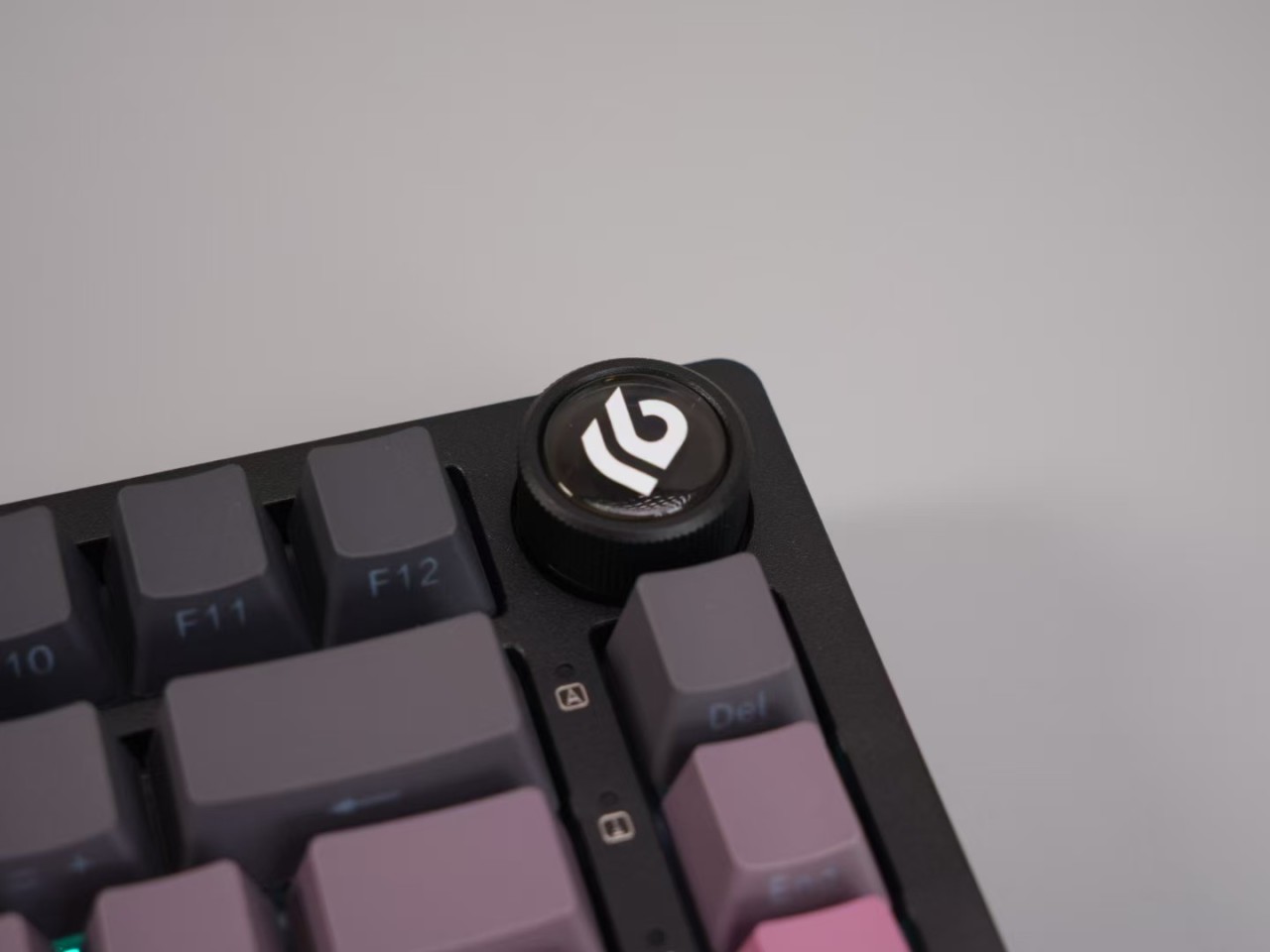 Hi75C 的音量滾輪,在衆多鍵盤中,手感堪稱一流。它分爲兩個部分,中間帶有 LOGO 的部分固定,無法旋轉,僅能從側面轉動。在手感方面,段落感十分強烈,操作起來反饋清晰,每一次旋轉都能精準感知。