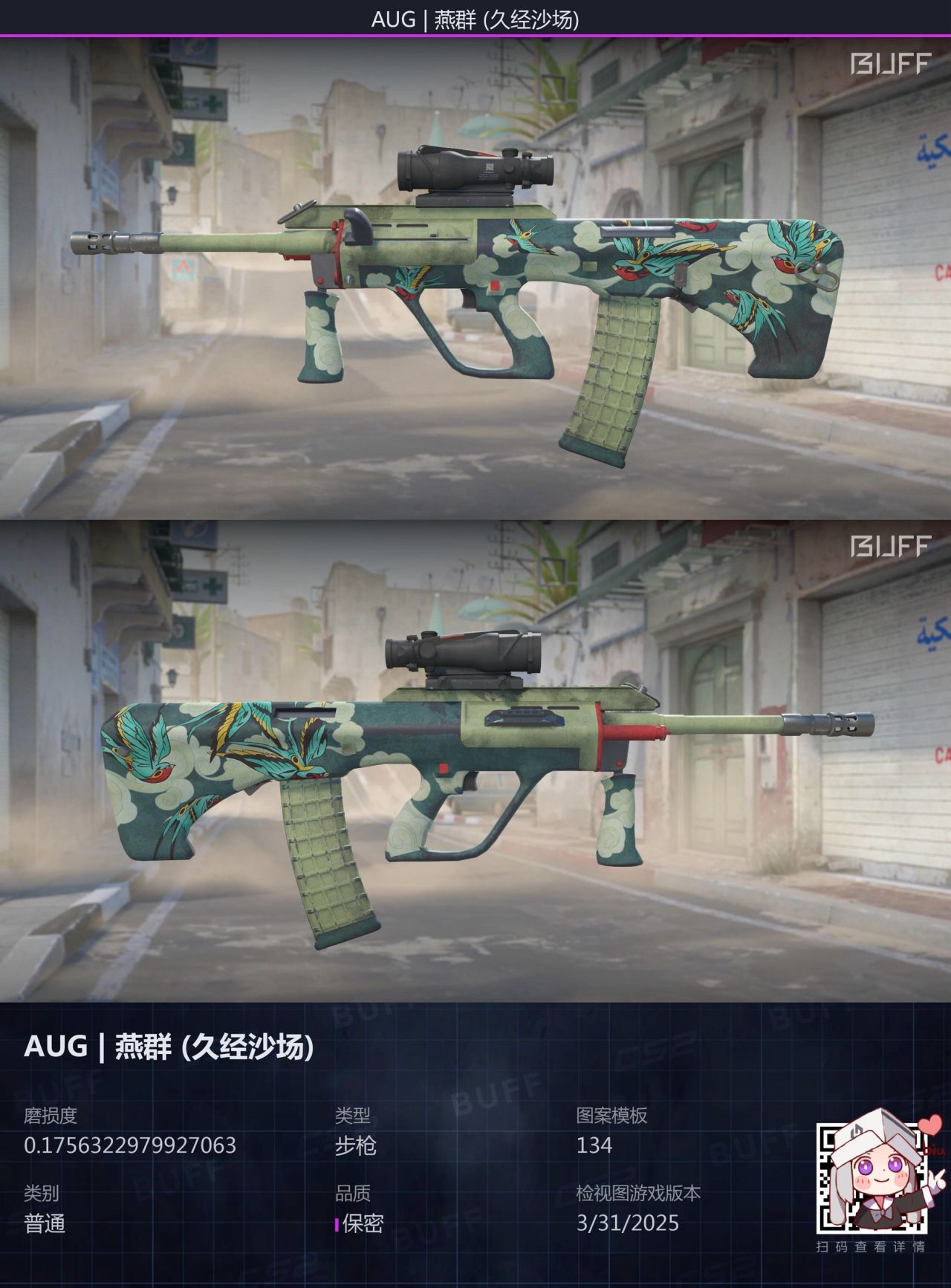 國風拉滿的一款皮膚,青綠色配色,加上小燕子的點綴,像小風箏一樣,低調大氣,很容易讓人聯想起來神話故事,唯一不足的就是髒兮兮的,嶄新也髒兮兮的,萌新很喜歡的一把槍