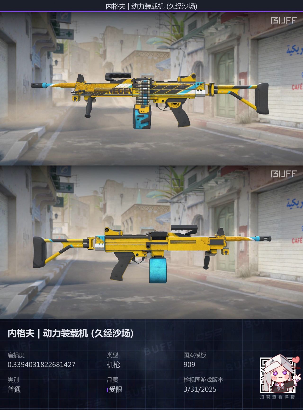 機甲風格的皮膚,黃色的配色,附有科技感的塗鴉,很帥,架點神器,也遇到了很多絕活哥,不過聽盒友說內格夫不能多玩,不然就不會用其他的槍了
