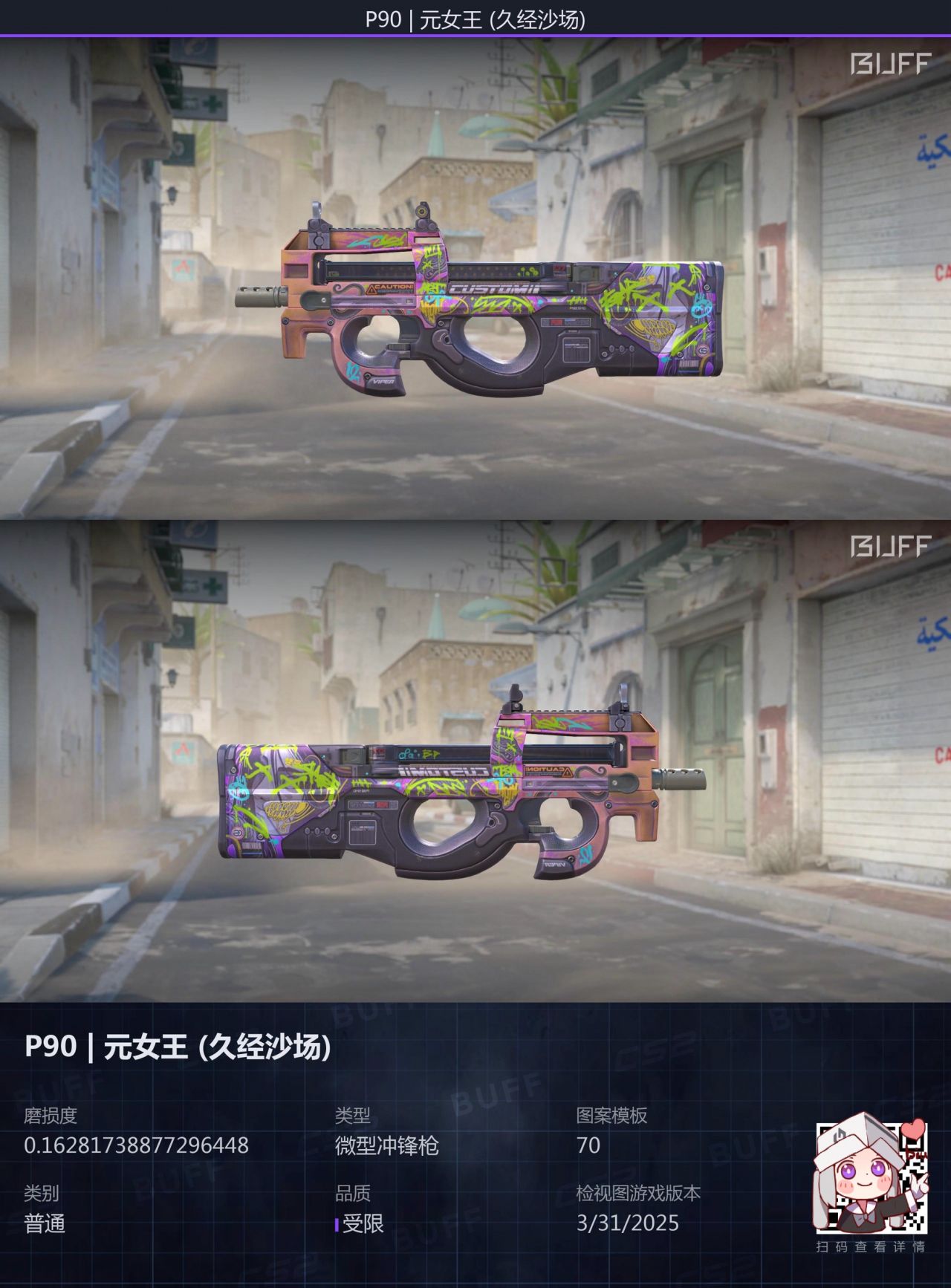 最後登場的是最貴的衝鋒槍P90,一款賽博風格霓虹配色的皮膚,高貴的漸變紫色,加上綠色塗鴉,後面還有一個帥氣的女王,很是霸氣,一個字:帥