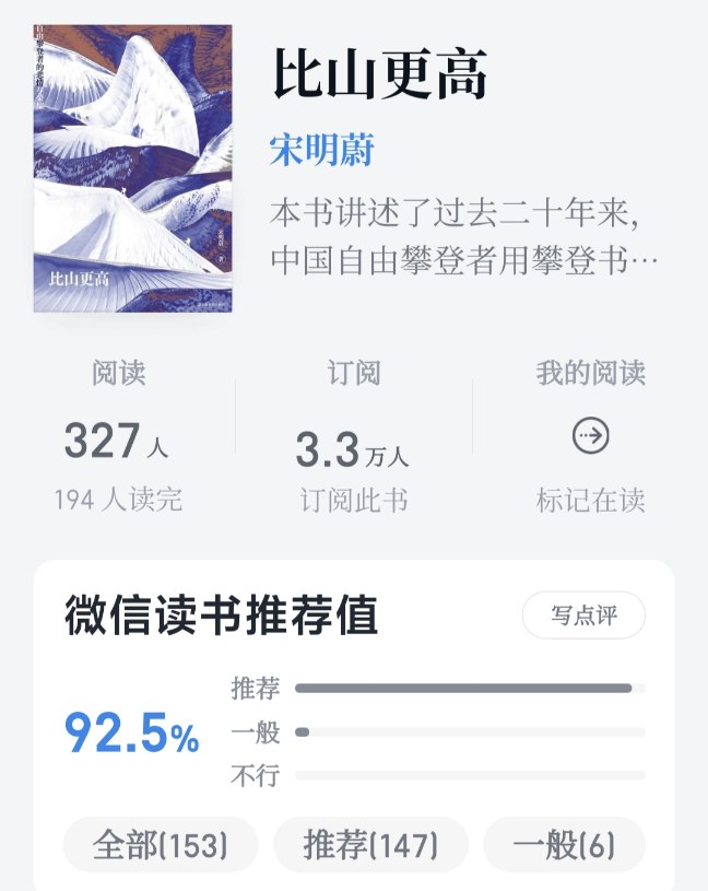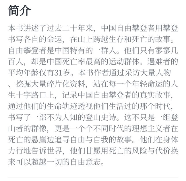看完微博內容,去搜了一下這本書,92.5%的好評,簡介如下:本書講述了過去二十年來,中國自由攀登者用攀登書寫各自的命運,在山上跨越生存和死亡的故事。
