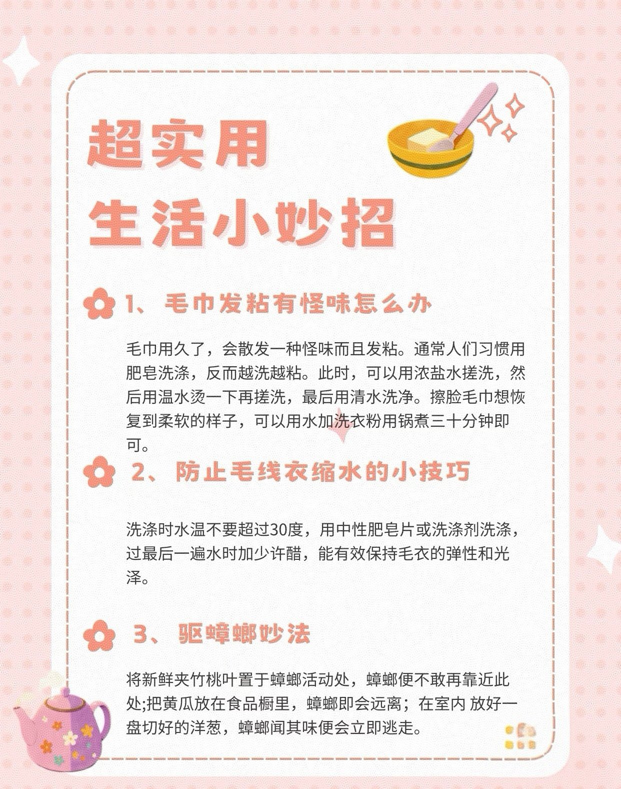 毛巾用久了,會散發出一種怪味而且發粘。通常人們喜歡用肥皂洗滌,反而越洗越粘。此時,可以用濃鹽水搓洗,然後用溫水燙一下再搓洗,最後用清水洗淨。擦臉毛巾想恢復到柔軟的樣子,可以用水加洗衣粉用鍋煮三十分鐘即可。