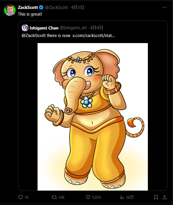 總之,在ZackScott這段時間“發癲”一般的帶動下,這股新的潮流在X上悄然蔓延開。不少畫師開始主動與這位遠近聞名的大象控互動,並繪製出大象形態的黛西公主二創,這也讓ZackScott相當驚喜——看吧,我就說總有一天,人人都會控大象的。在這一刻,“大象化”從ZackScott單方面的XP,轉變爲畫師們的主動配合。