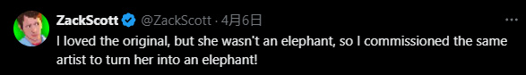 於是,ZackScott這股對大象的喜愛之情,開始變得一發不可收。他深知,單純依賴發推文的方式來“求圖”,註定不可持續發展。唯有依靠“鈔能力”,才能讓全世界知道,大象就是最好的信仰。在這之後,一句“我喜歡原版,但她不是大象,所以我委託原畫師把她變成大象”的宣言,就成了ZackScott日後推文的唯一主題。
