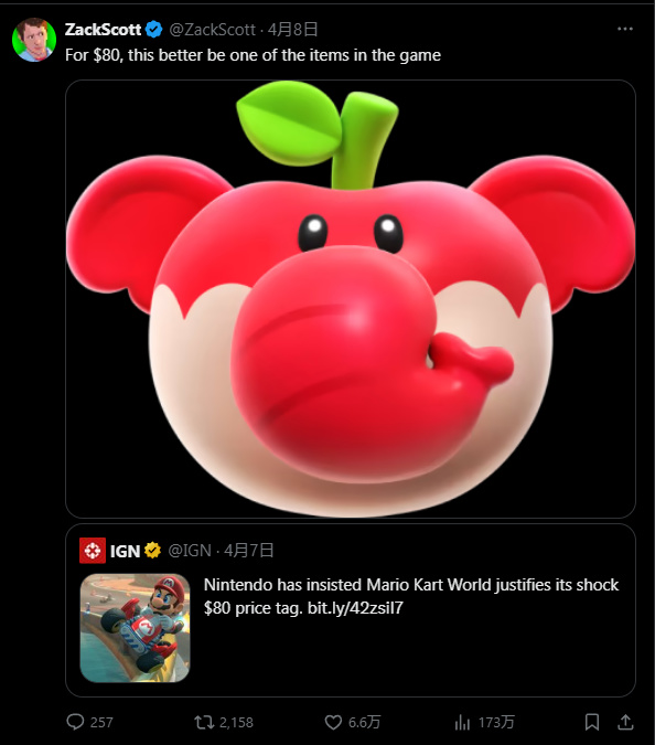 況且,ZackScott可是個連吐槽80刀的Nintendo Switch 2遊戲,都要帶上一句“大象果實”的整活狠人——“花了80塊,這遊戲裏最好有這件物品。”