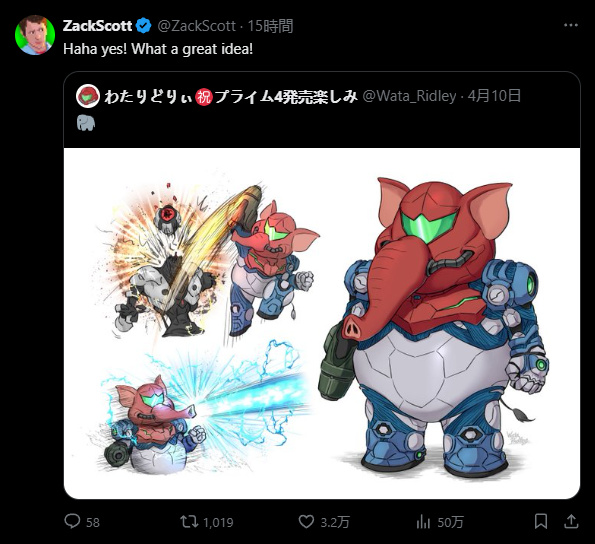 這股大象化的風潮,也並不會在黛西公主身上停止。它很快擴展到了其他角色身上,就比如同屬任天堂的“薩姆斯”,作爲電子遊戲史上的第一個女角色,如今便成了這股“大象化”風潮在馬力歐IP以外影響的第一人。一位經常繪製“密特羅德”同人插畫的畫師加入其中,將薩姆斯也給“大象化”,甚至在原作的基礎上設計了“大象薩姆斯”的戰鬥動作。而這也被ZackScott加以轉發,並稱這是個相當不錯的點子。