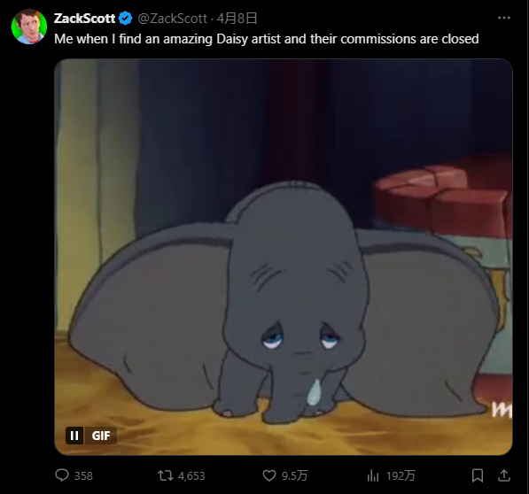 而ZackScott即便在約稿的道路上遭遇挫折——比方說看中了某張黛西公主插畫,結果作者已經不再接受約稿——他也僅僅用最愛的小象表情包表示一下沮喪,再開始新一輪的約稿,而非借鑑評論區中想法“用AI對付一下”。