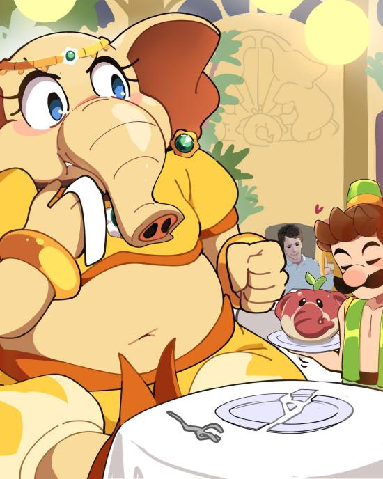 這樣一想,其實ZackScott的想法倒也是合情合理——畢竟,這本就是《超級馬力歐兄弟 驚奇》的官設。只不過在官設裏,大象形態的角色們只是平平淡淡地穿着遊戲默認的那一套衣物,要是能讓“大象”穿上其他樣式的衣服,那該有多好啊?很快,在那條推文發出後,當天就有畫師跟上了他的腦洞,並依照這張截圖繪製了“大象化”的黛西公主,讓ZackScott大爲興奮。