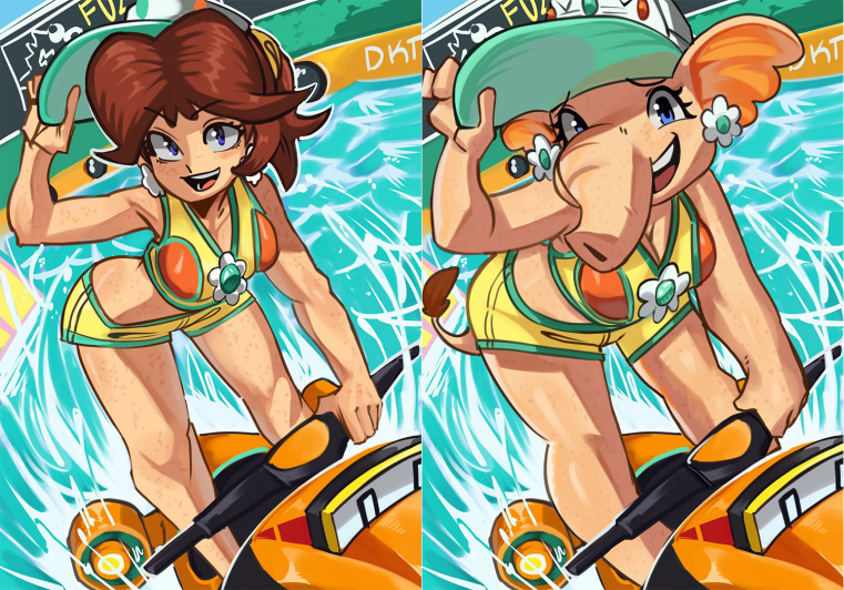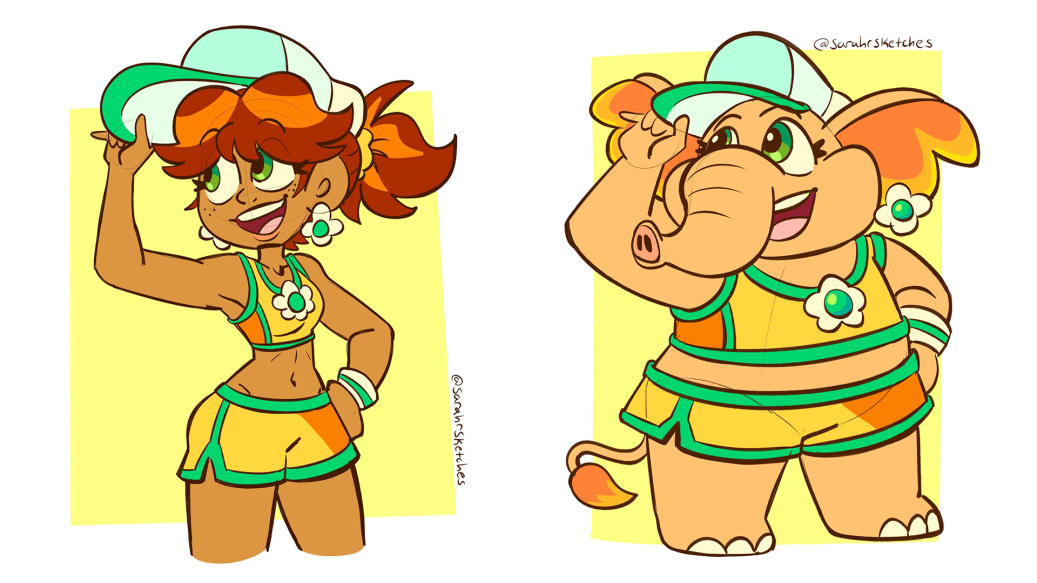 具體來看,就是ZackScott在X上到處蒐羅黛西公主的相關二創插畫,並聯系繪製插畫的原畫師,有償委託對方將稿件進行一定的修改——讓圖中的黛西公主變成大象形態。至於爲什麼是黛西公主,或許是因爲她的設定更加外向,也更適配某些充滿元氣的服裝吧,比方說這幅非常有“運動少女”韻味的插畫被ZackScott看中,委託畫師重繪了神態與結構都完全一致的“大象化”黛西。