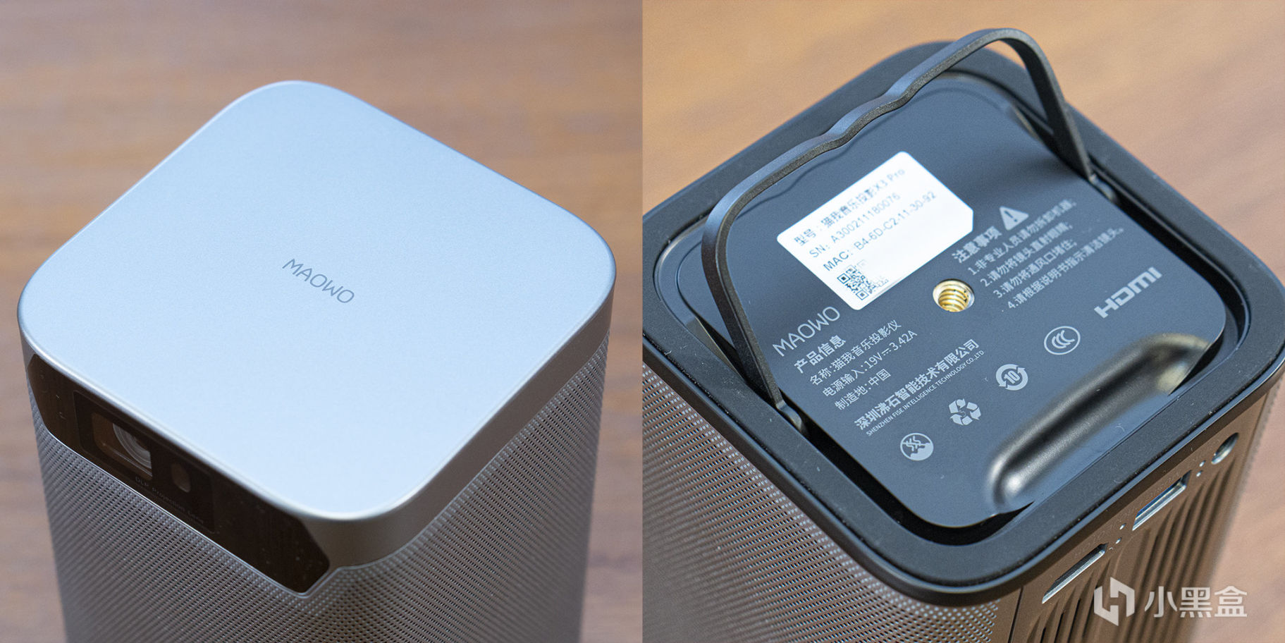 沉甸甸的手感,嗯,不错!电子产品的重量总是让我生出许多好感!纯黑底色上的银色X3,MAOWO,Music Projector等字符,很简约。