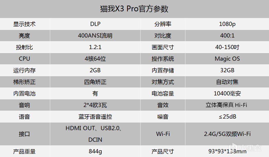 猫我X3 Pro内置了10400mAh的电池,长达3个小时的续航,方便我们随时随地随心使用。此外,它还支持WiFi 5G/2.4G网络,支持蓝牙4.0连接和HDMI输入。