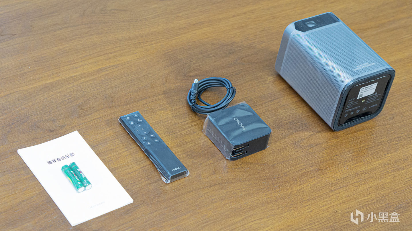 打开包装箱,拿走“扉页”和说明书,右边是猫我投影仪本体,左边是电源、遥控和电池。每一样都附带着保护膜,还是挺细心的。