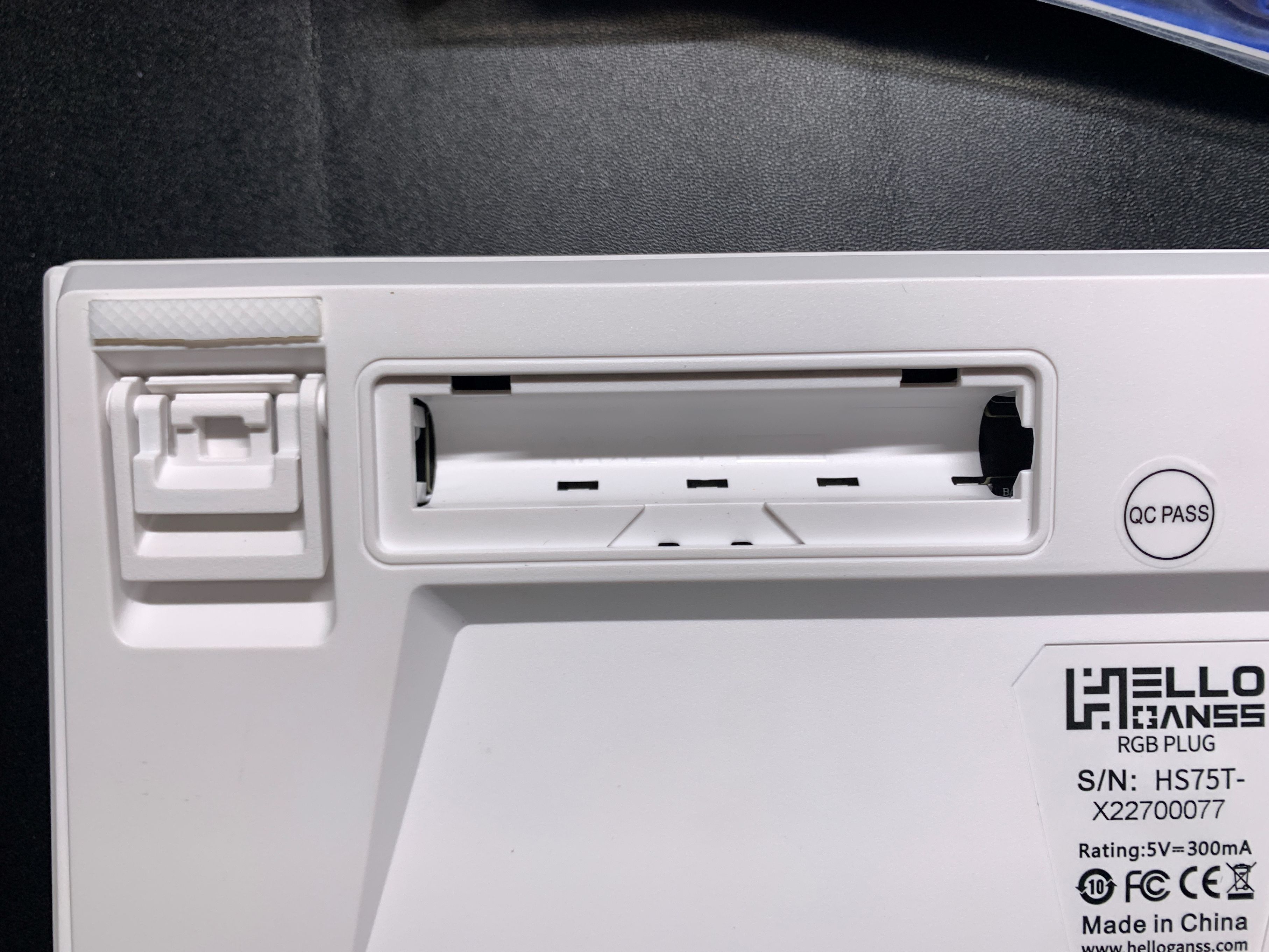 电池的供电部分,hs75t采用的是干电池充电的方式,四节5号电池供电,但是这里包装盒就给我了两节五号电池,这说实话我有点蒙,说道这里有人就好说干电池是什么供电,为啥不用锂电池,确实锂电池方便没电了直接可以插上线就冲,但是各位我们要考虑一个实际的问题,锂电池的寿命,随着时间的推移,寿命会越来越少,而且键盘带锂电池我记得上飞机是不允许托运的,当然了不能否认的她用干电池供电没电了插上线不能给电池充电的一个缺点还有后期的电池也要单独去购买的问题(一块南孚两块五这四块就是十块钱,这十块钱我能买20包辣条!),续航方面在关灯的情况下可以达到四个月(官方说的,我没有测,主要是时间太长,那时候吃粑粑都赶不上热乎的了)