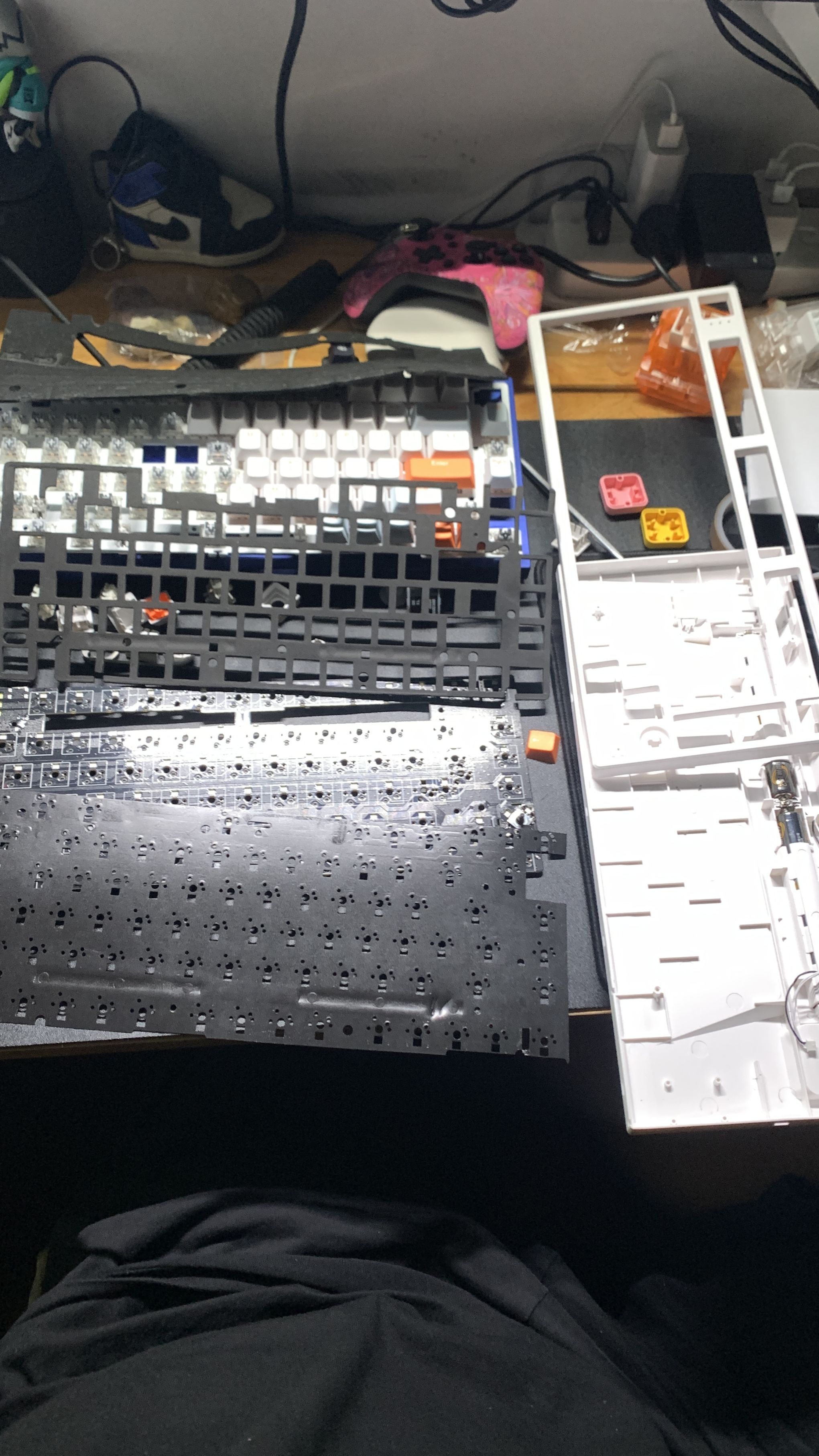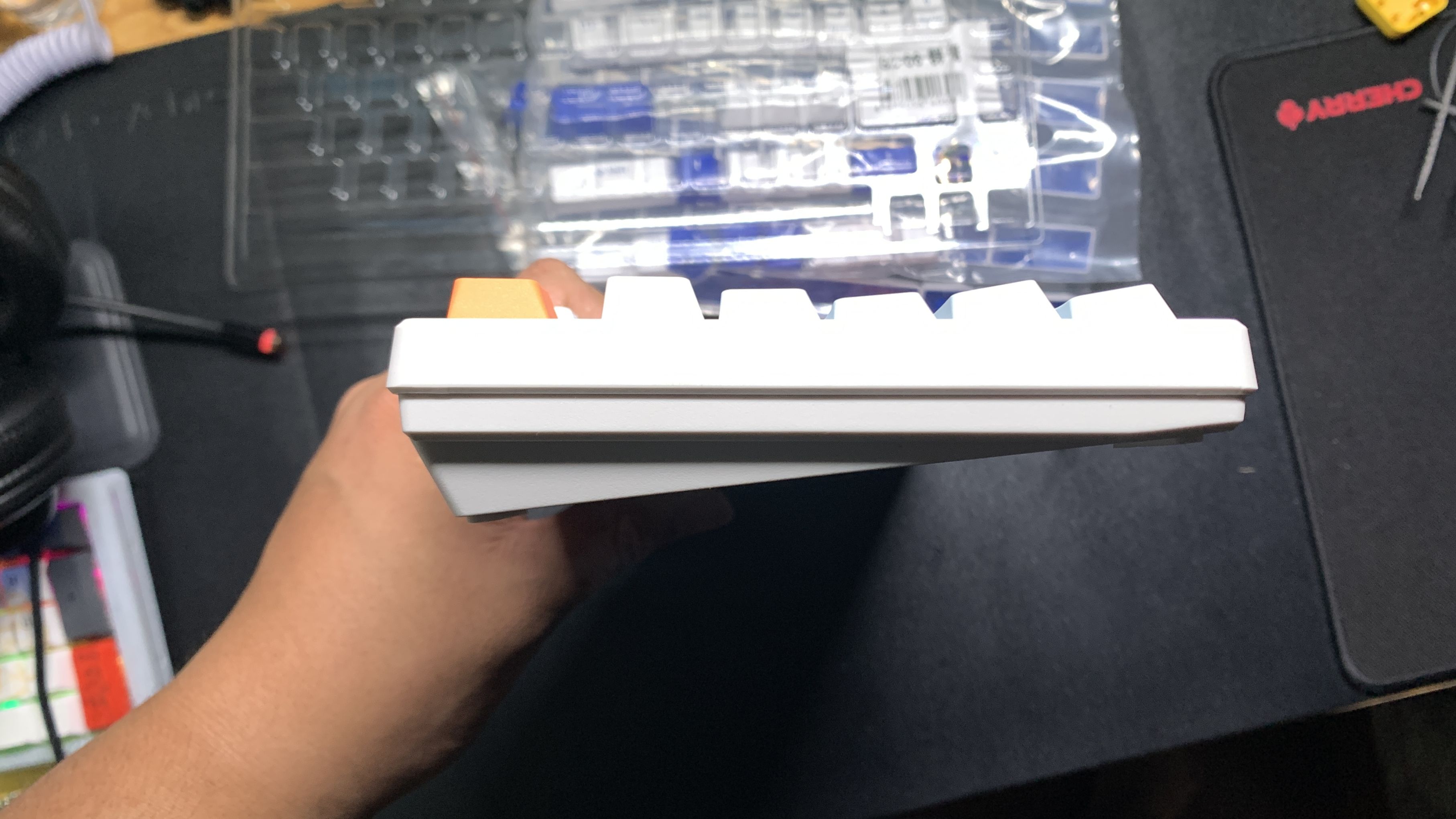 这把键盘能从到我收到之后到现在,不间断的使用了一段时间,给我给我的总体体验是,大键稳定性可以(不知道是不是送测原因)我这把键盘只有左shift有一点点杂音,空腔把握的还不错,但是空格空腔略重(键盘通病),关于这个摇杆我是又爱又恨,爱是因为我没事可以玩这个摇杆,恨就是因为他不是一个类手柄的摇杆,而是一个固定的,关于旋钮呢我是真的无话可说,首先设计成热插拔的形式我肯定要表扬这个设计,但是!我很不理解这个旋钮设计的,我是一个很喜欢75配列带音量调节旋钮的人,但是吧,这搞得,说要用两个手指头调节我不理解,而且在关灯的情况下透光。关于键盘的整体配置方面啊,我这里还是说高斯牛!为啥啊?因为他键盘里面塞得东西实在是太多了,两套键帽,单独的拔键拔轴器,独立开槽的防尘盖,只能说该有的都有了,该有的细节都有,但是有的细节还需要完善一下,键盘声音的话,我这里因为是打样的版本所以用的g银pro的轴体,大货版本里面并没有这个轴体,所以我不能给出一个大货版本声音的表现,但是在这种对堆料情况下,只能说是声音不会太差。