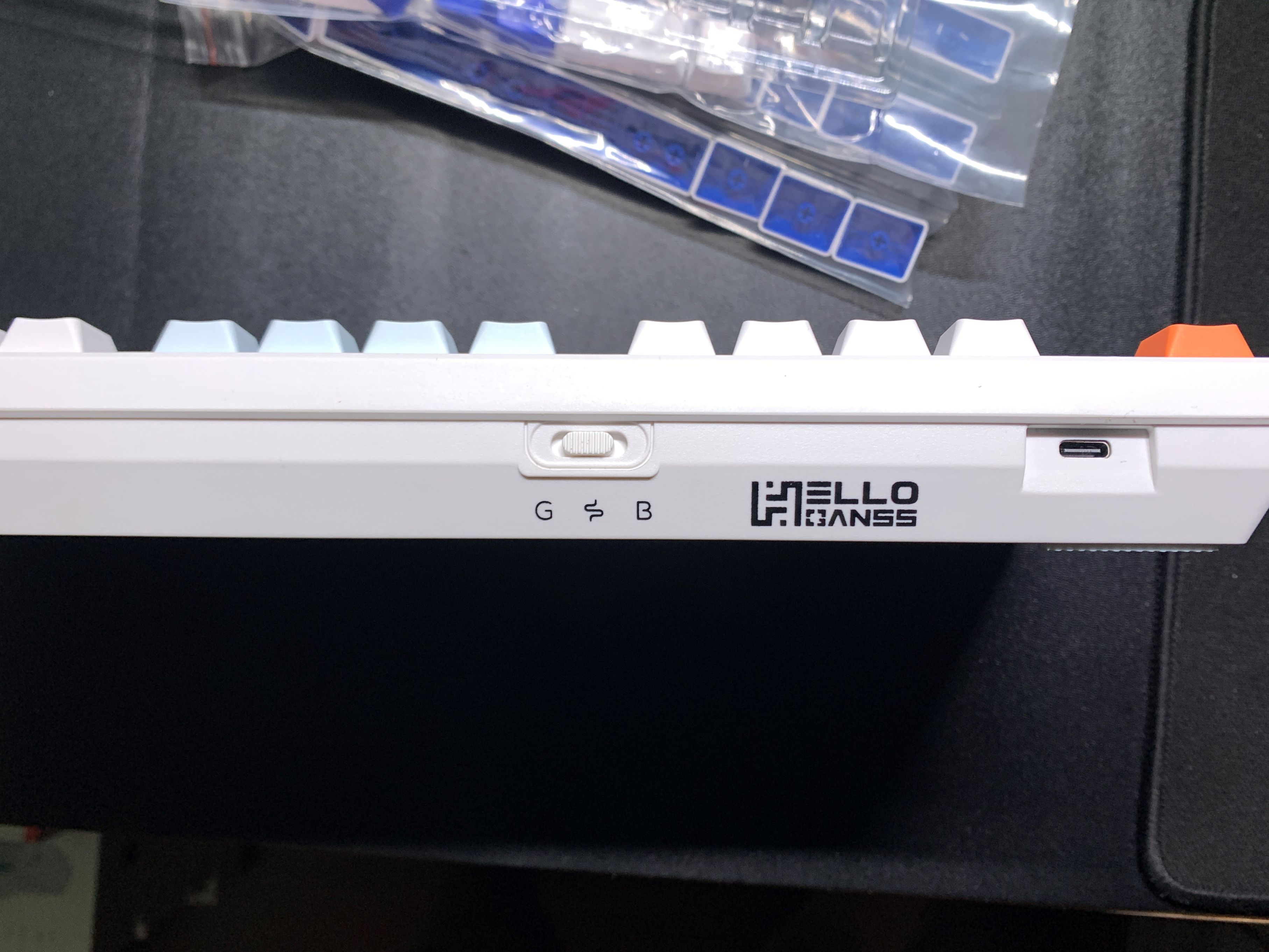 键盘的左边集成了这把键盘的logo模式切换开关一节电源接口,这里说一下啊,我这个是干电池版本的,在再切换成无线模式下,灯是不亮的,说是为了省电,但是官方说了在后续会出固件,想要灯效的可以刷固件,同时如果觉得开灯之后费电的,可以再刷固件刷到无光的。