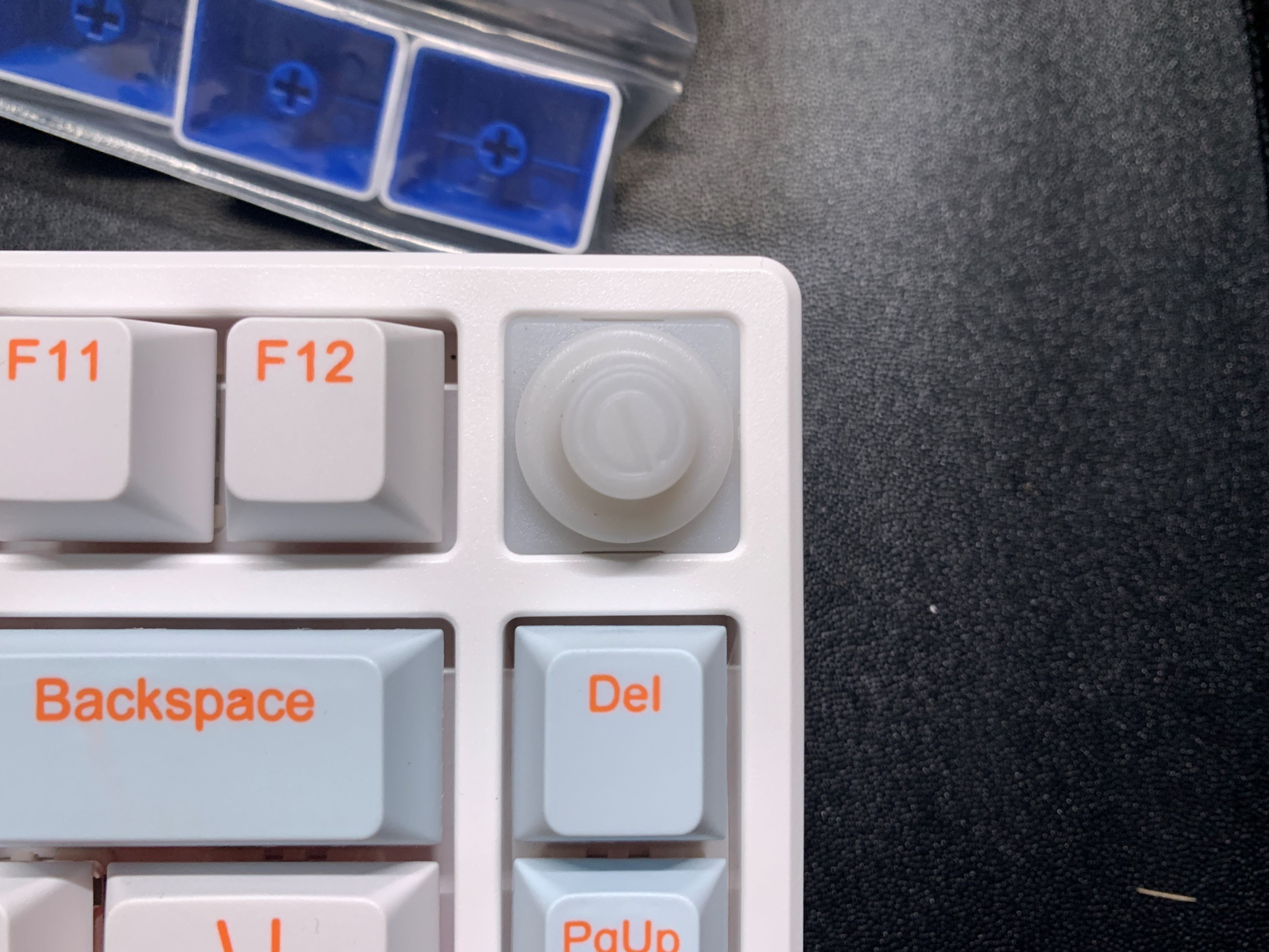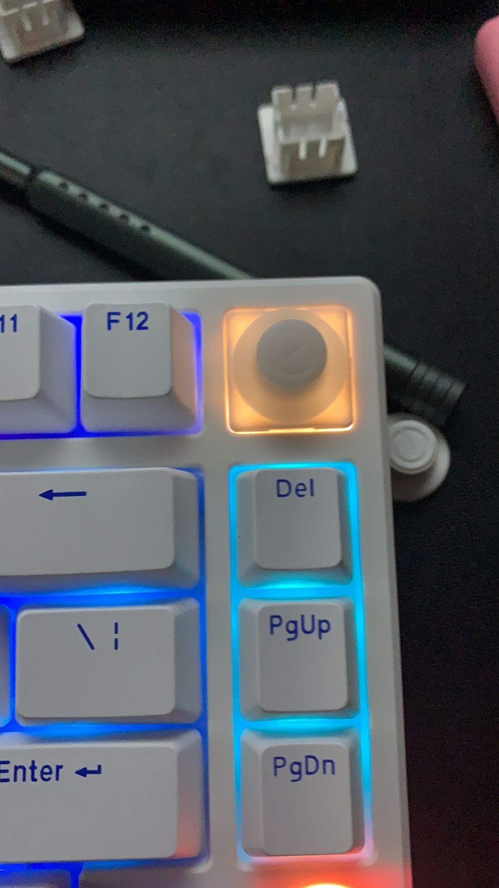 让我们先来看看这个我认为最丑的旋钮,这里我很不明白是哪一个大聪明设计师设计的这个旋钮,是真的丑,而且!在关灯的情况下他这玩意竟然透光,官方说的这个说是什么要用两个手指扭动,不是一个手拨动的大旋钮,对不起我理解不了,一个手能完成的操作为什么要用两个手指头进行呢?我是真的不知道咋说这个旋钮了,但是好在他这个旋钮设计的是一个热插拔版本的也就是一个模块化的设计,这里我也联系了高斯的人,他们说后续会推出金属铭牌,到时候用个铭牌装上去不比这个好看多了?在拔掉旋钮之后你可以把它当成一个铭牌或者插上轴,插上轴之后他默认是一键静音的功能,这很好啊,这跟队友骂起来一键闭麦(开玩笑的)